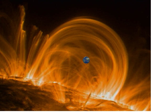 Dove il pianeta prende e dove noi dovremo prendere l’energia del futuro. Nella foto una eruzione solare fotografata dal satellite Soho (la terra è sovrapposta in scala) .