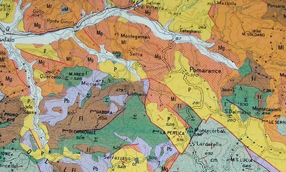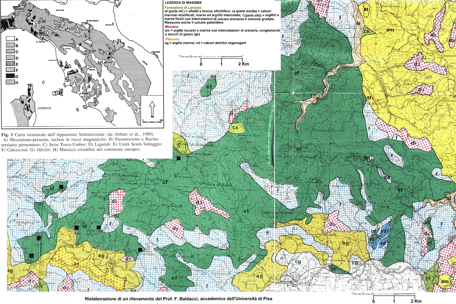 Le ofioliti sarebbero pezzi delle rocce che costituivano il fondo di questo antico oceano sulle quali si depositarono le suddette formazioni, venendo verso nord a costituire il basamento di quella che sarà l’Unità Ofiolitica Interna con ofioliti in posizione primaria (diffusa oggi in Liguria orientale, all’ isola d’Elba e nella zona costiera della Toscana meridionale) e, più a sud, intercalazioni nell’Unità Ofiolitica Esterna a guisa di olistoliti (grossi massi ofiolitici anche di qualche km con parziale copertura) con ofioliti per lo più in posizione secondaria, cioè incluse in formazioni sedimentarie torbidiche del Cretaceo-Eocene [5]. Quest’ultime formazioni sono rappresentate in zona dal Flysch Calcareo-Marnoso del Cretaceo inf.-Paleocene che insieme a quello di Lanciaia (Paleocene medio-Eocene), costituiscono oggi la Liguride dominante nella Toscana meridionale e nell’ambiente in studio [6].