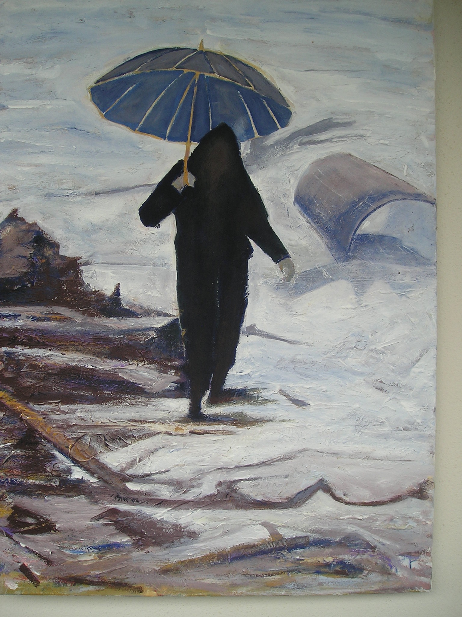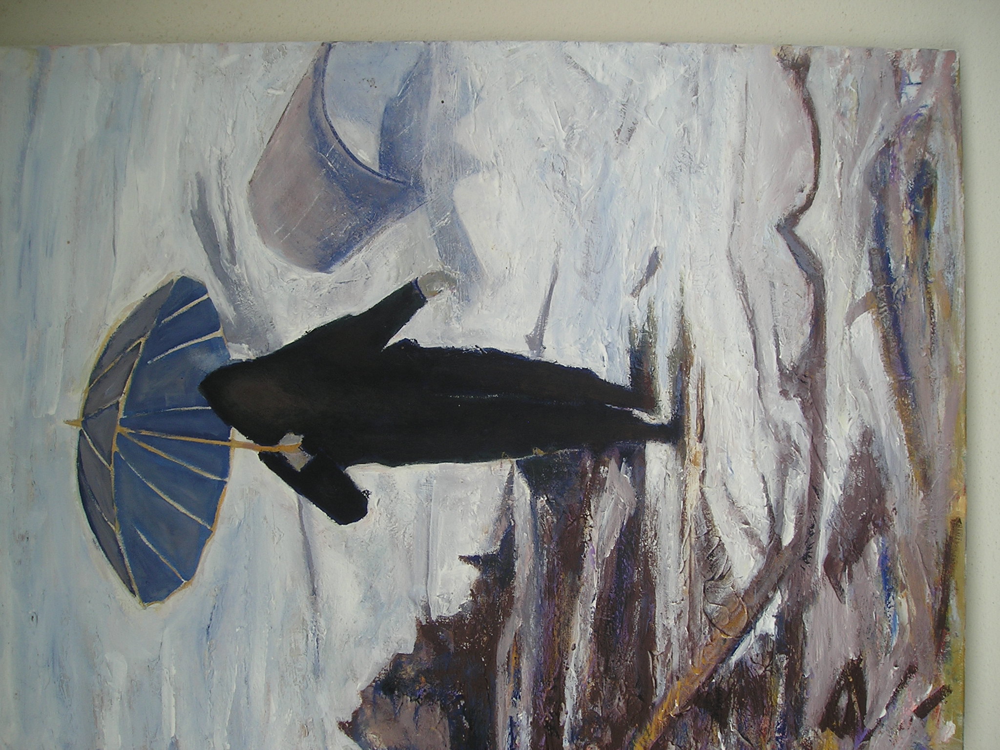 La pittura è  DONNA OSCURA CON OMBRELLO E MARINA TORMENTATA