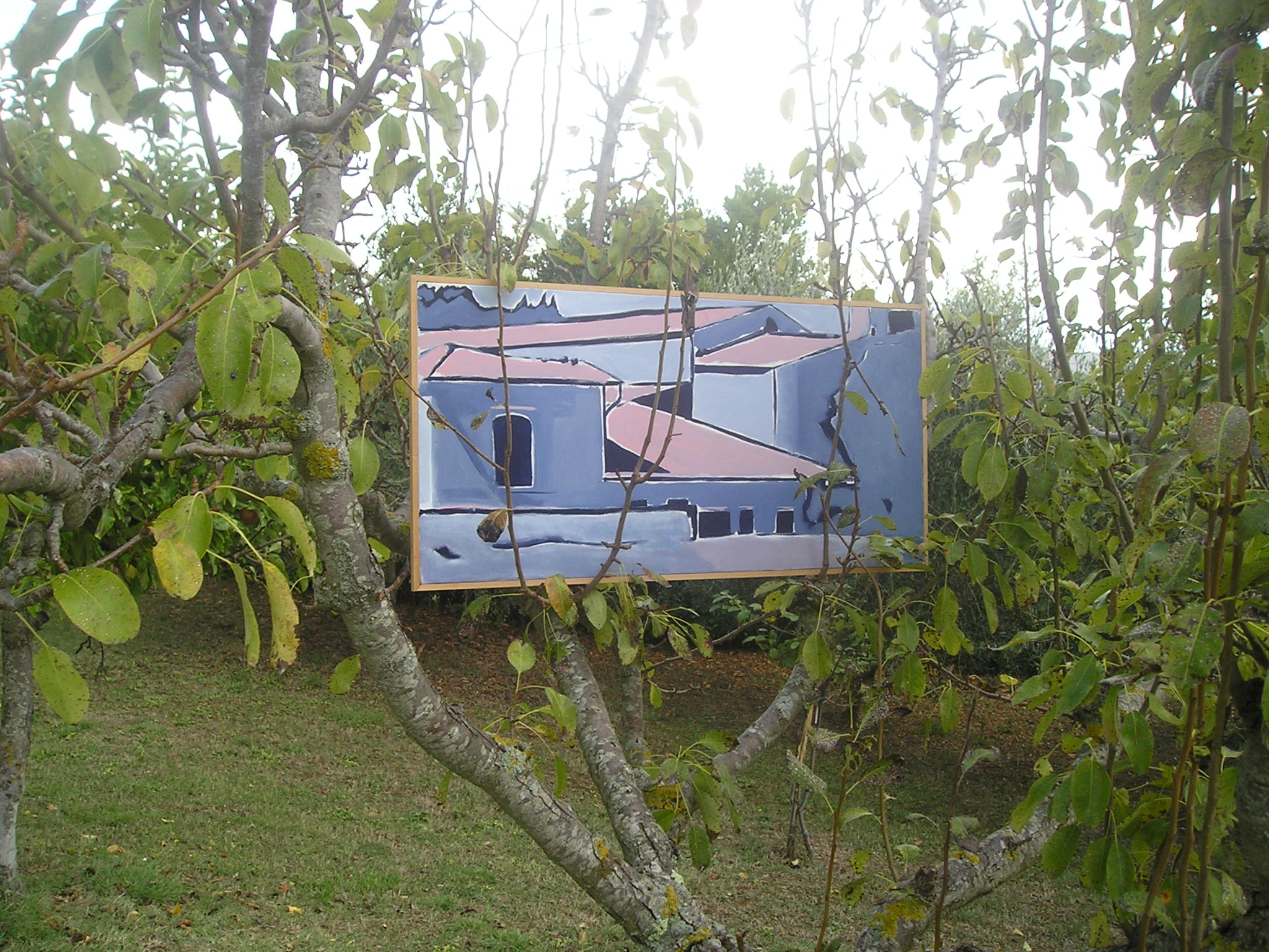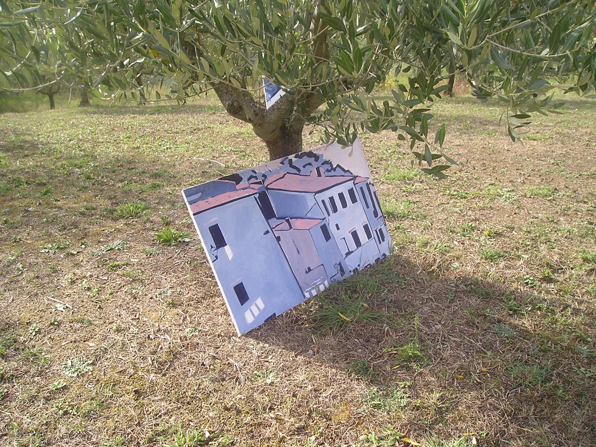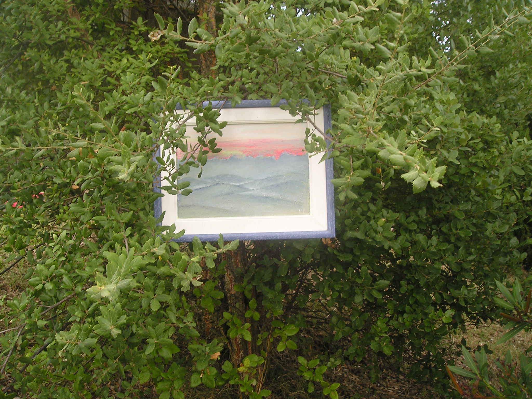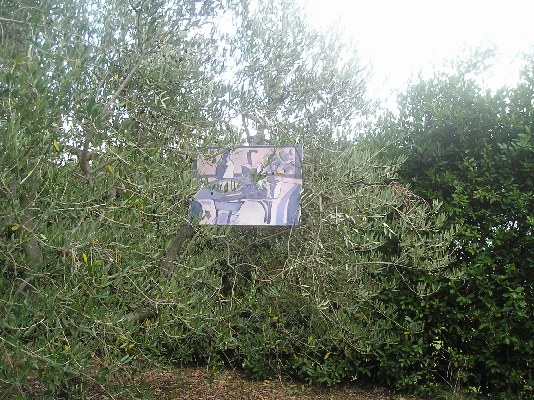 Il quadro ad ‘ulivi blu’, allungato e stretto fra i rami dei due cipressi del ‘Carducci’, sembra dischiudere un varco verso uno scorcio di paesaggio che non c’è.