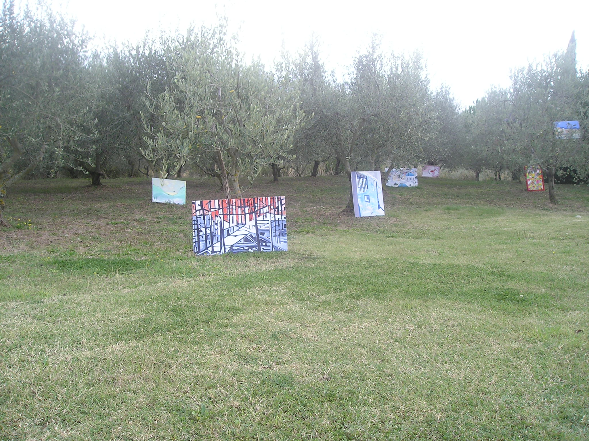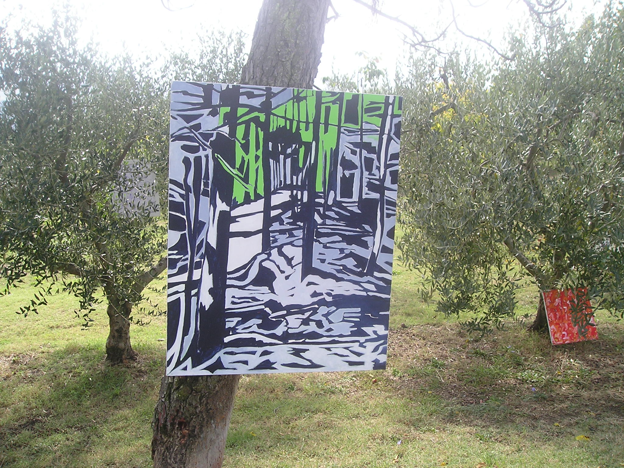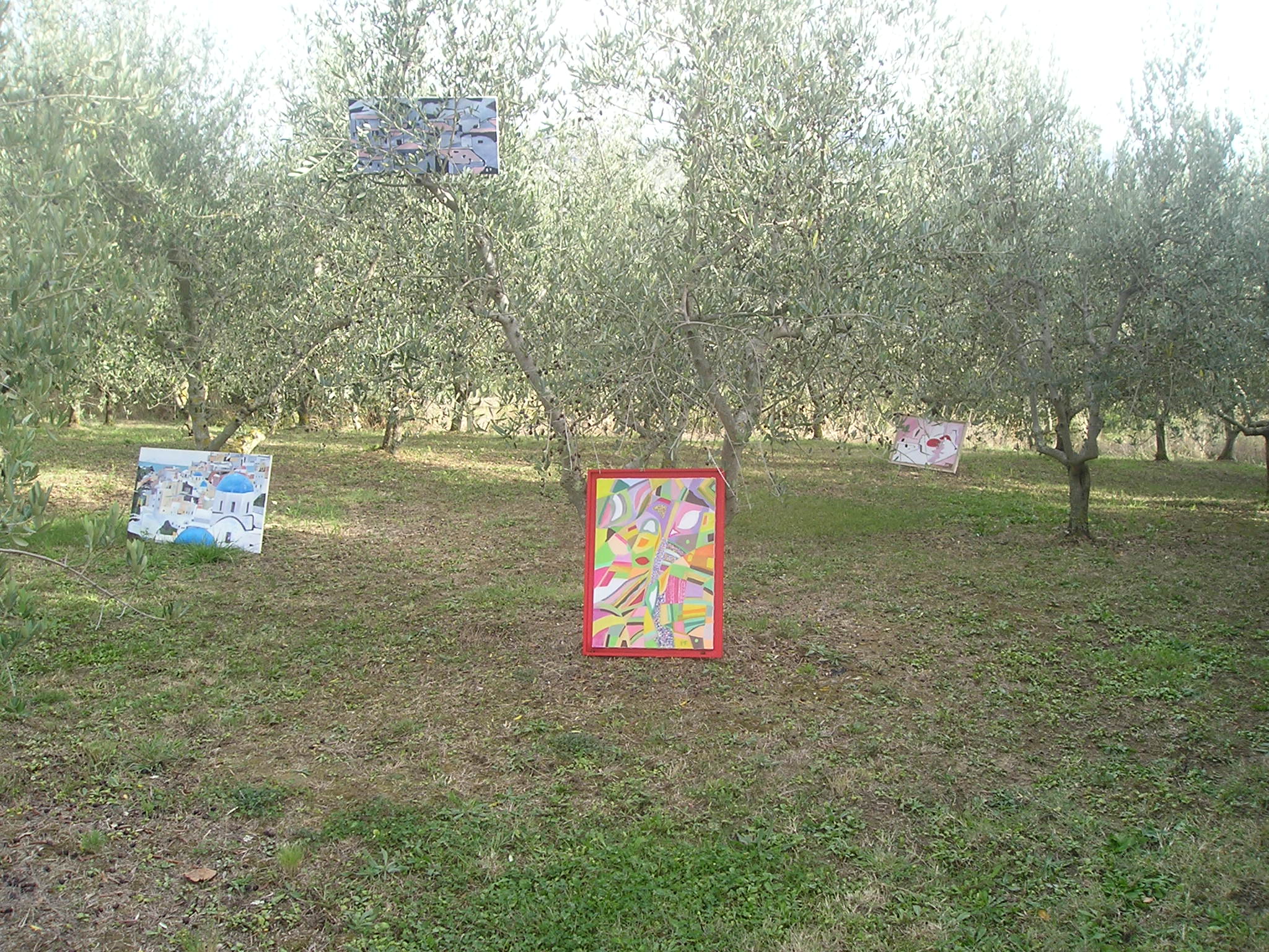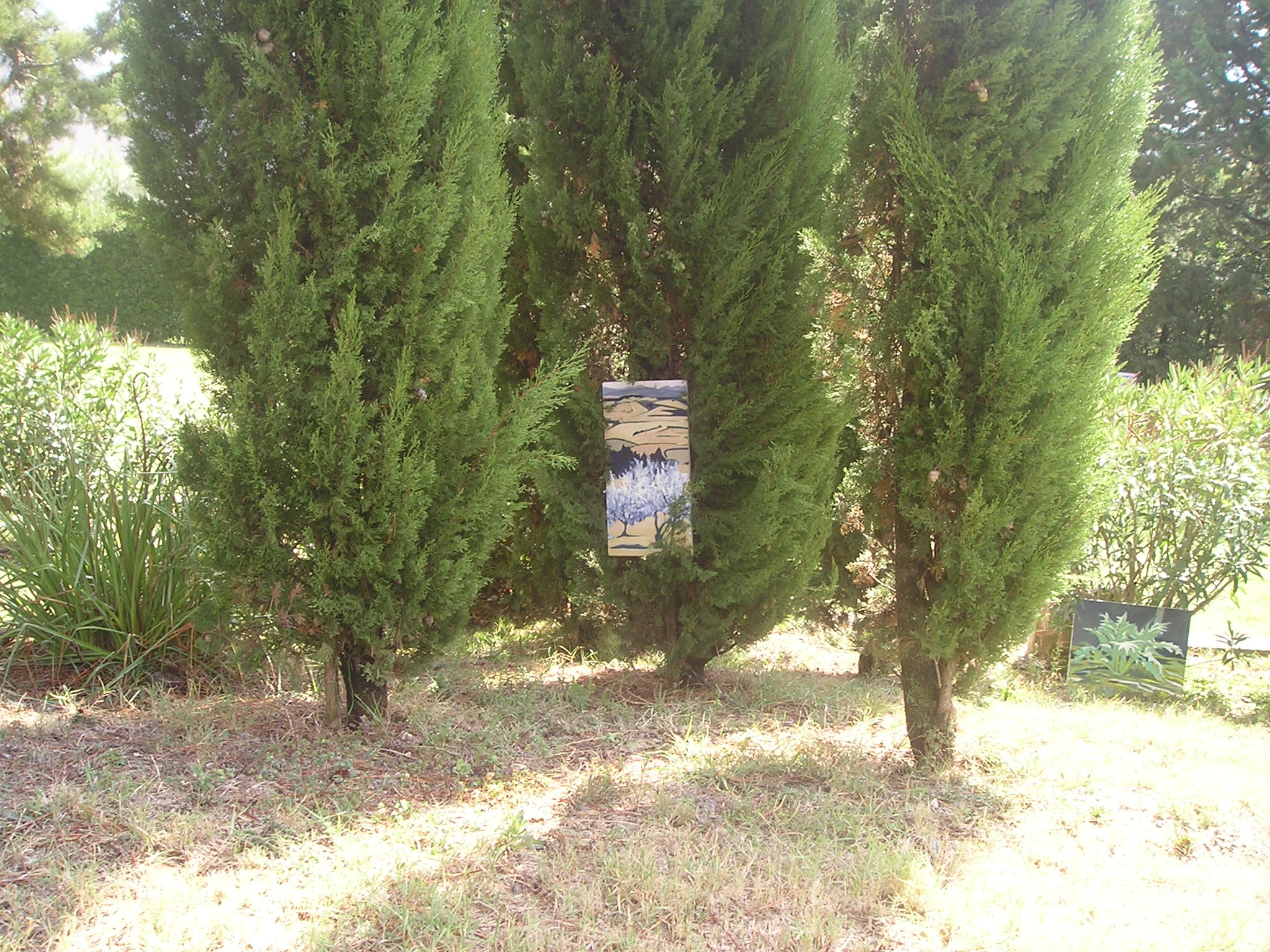 Il quadro ad ‘ulivi blu’, allungato e stretto fra i rami dei due cipressi del ‘Carducci’, sembra dischiudere un varco verso uno scorcio di paesaggio che non c’è.