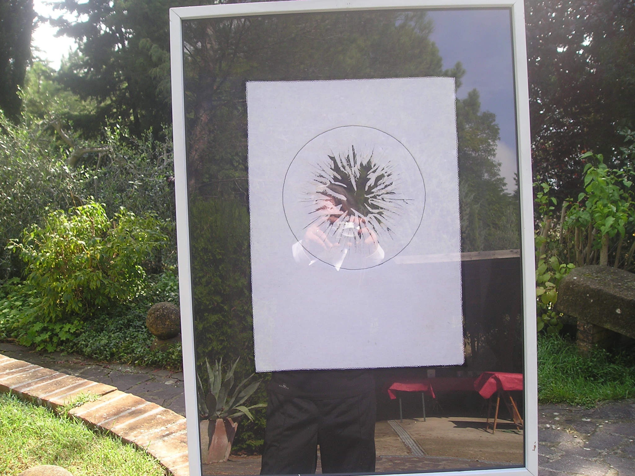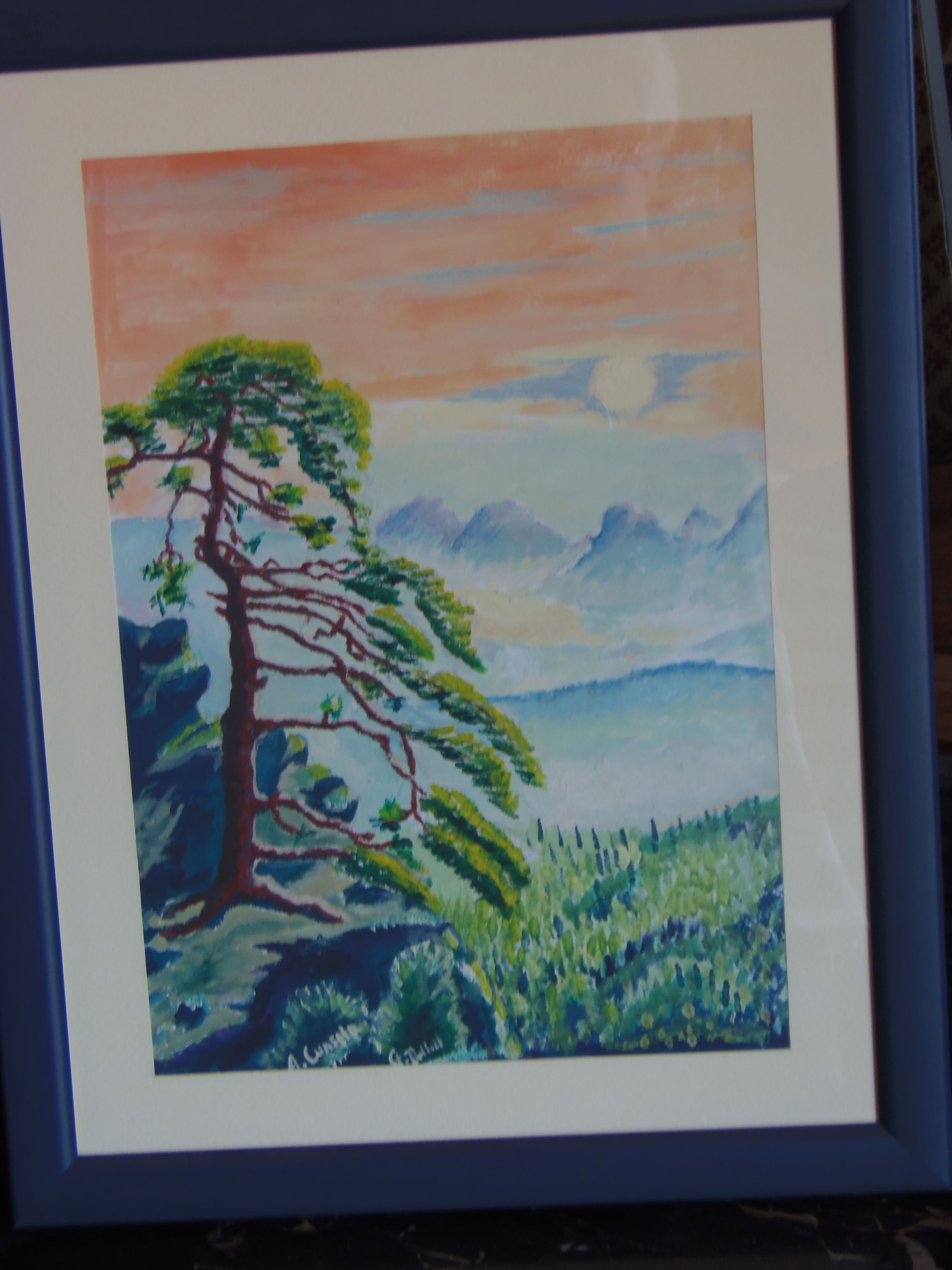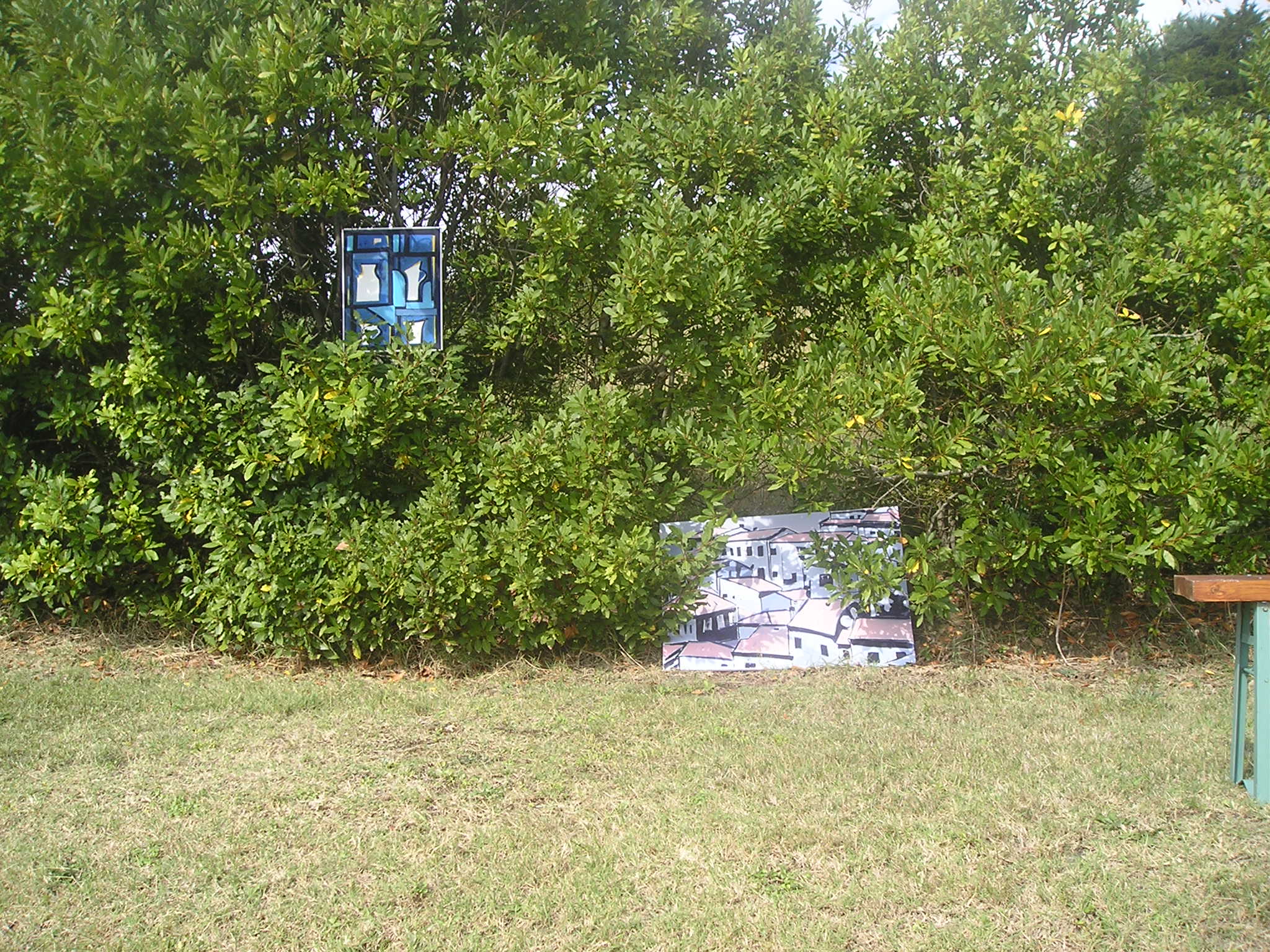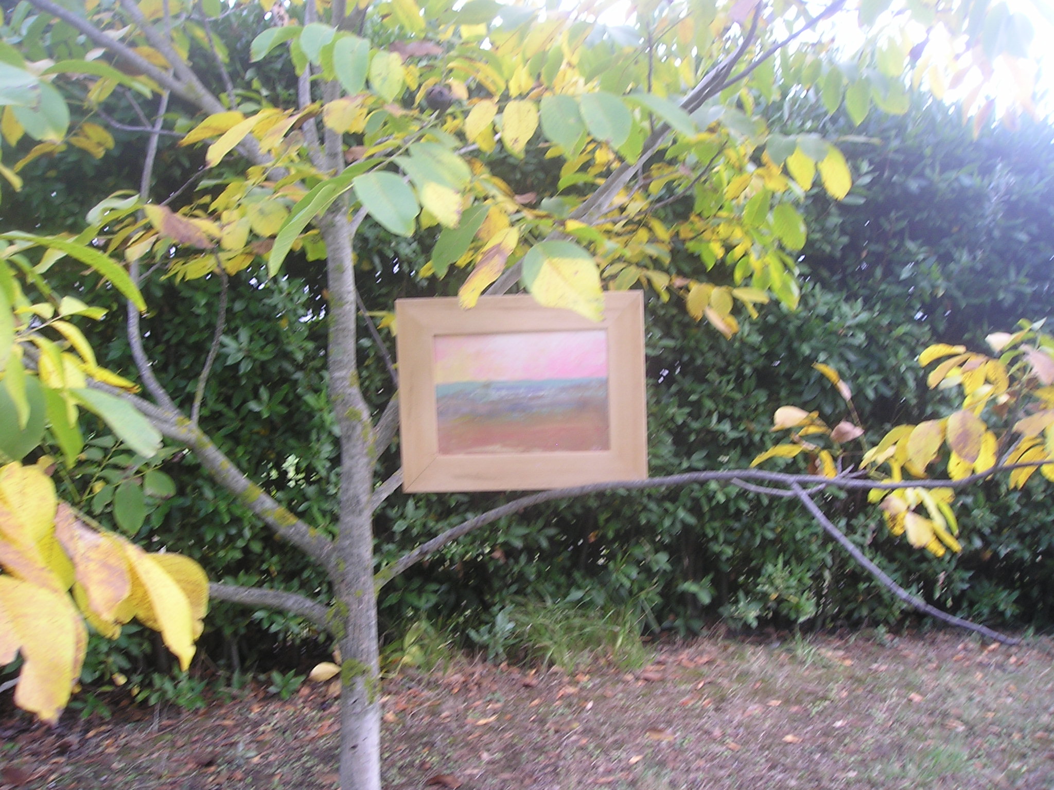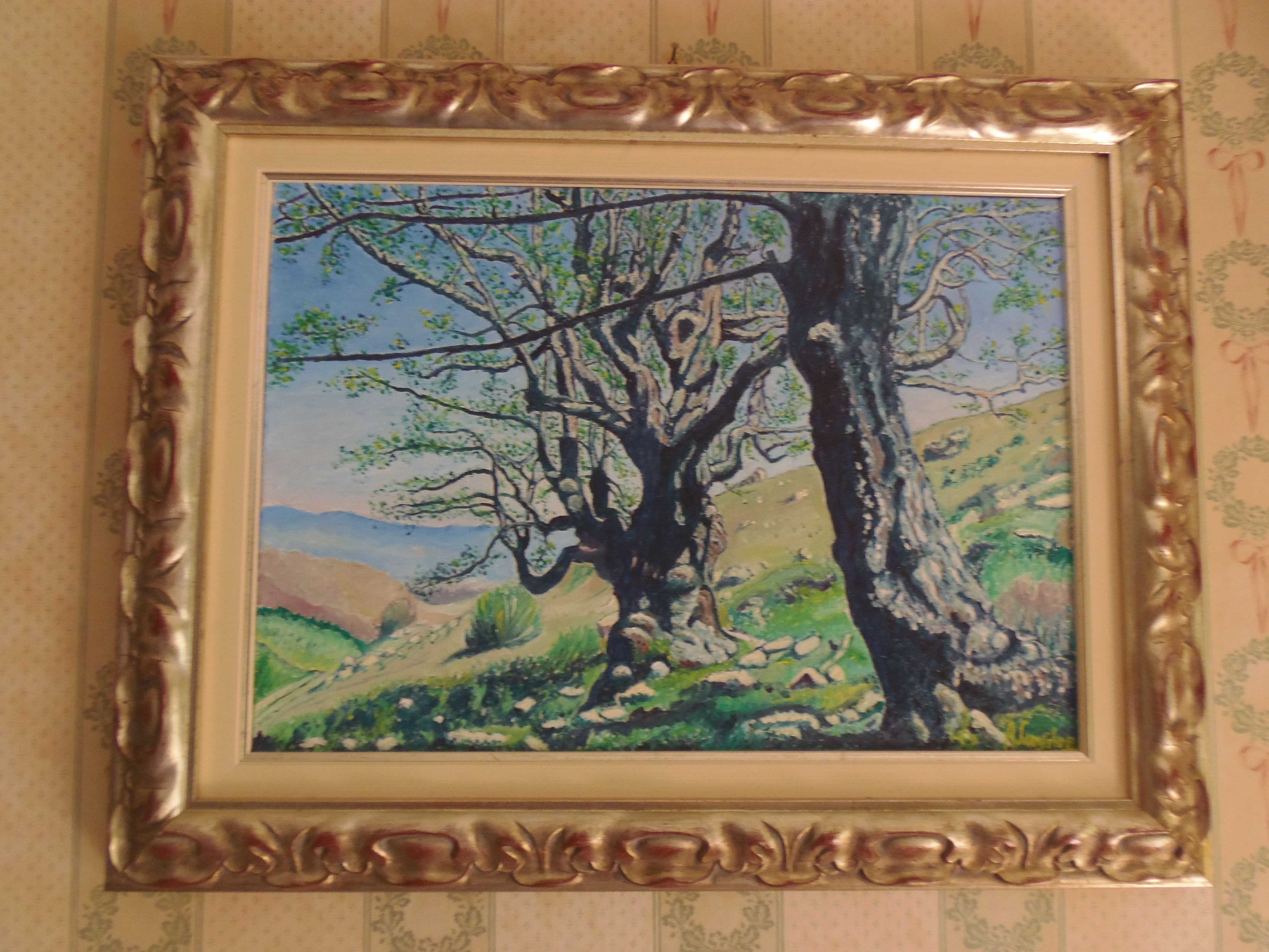 Il quadro ad ‘ulivi blu’, allungato e stretto fra i rami dei due cipressi del ‘Carducci’, sembra dischiudere un varco verso uno scorcio di paesaggio che non c’è.