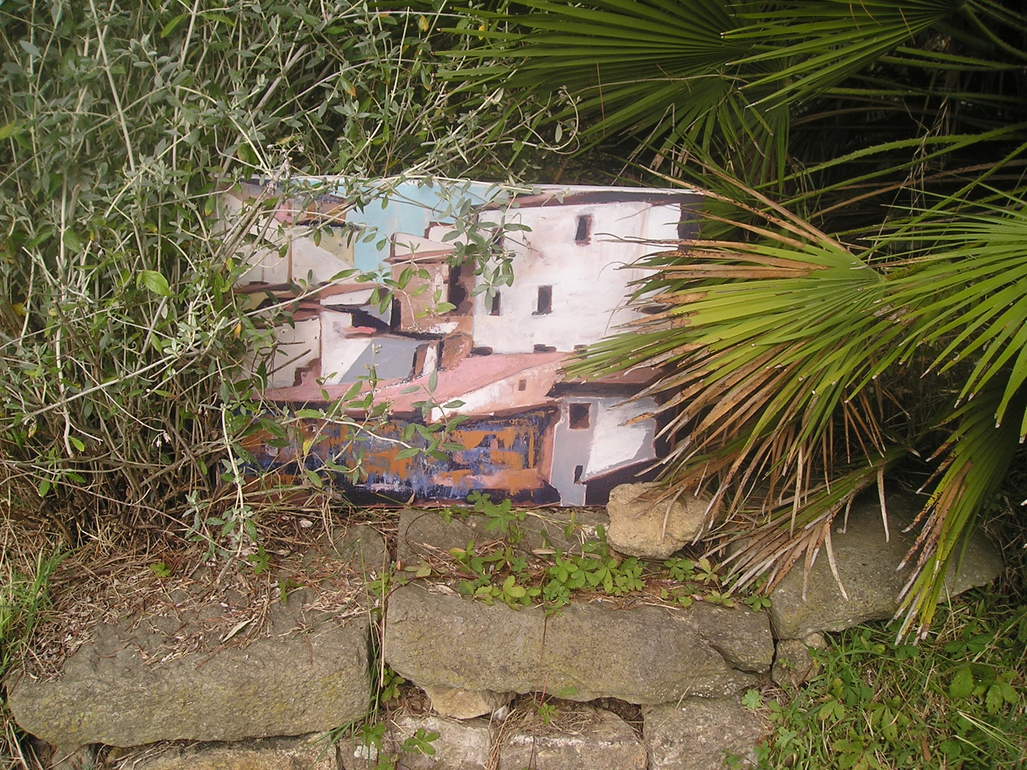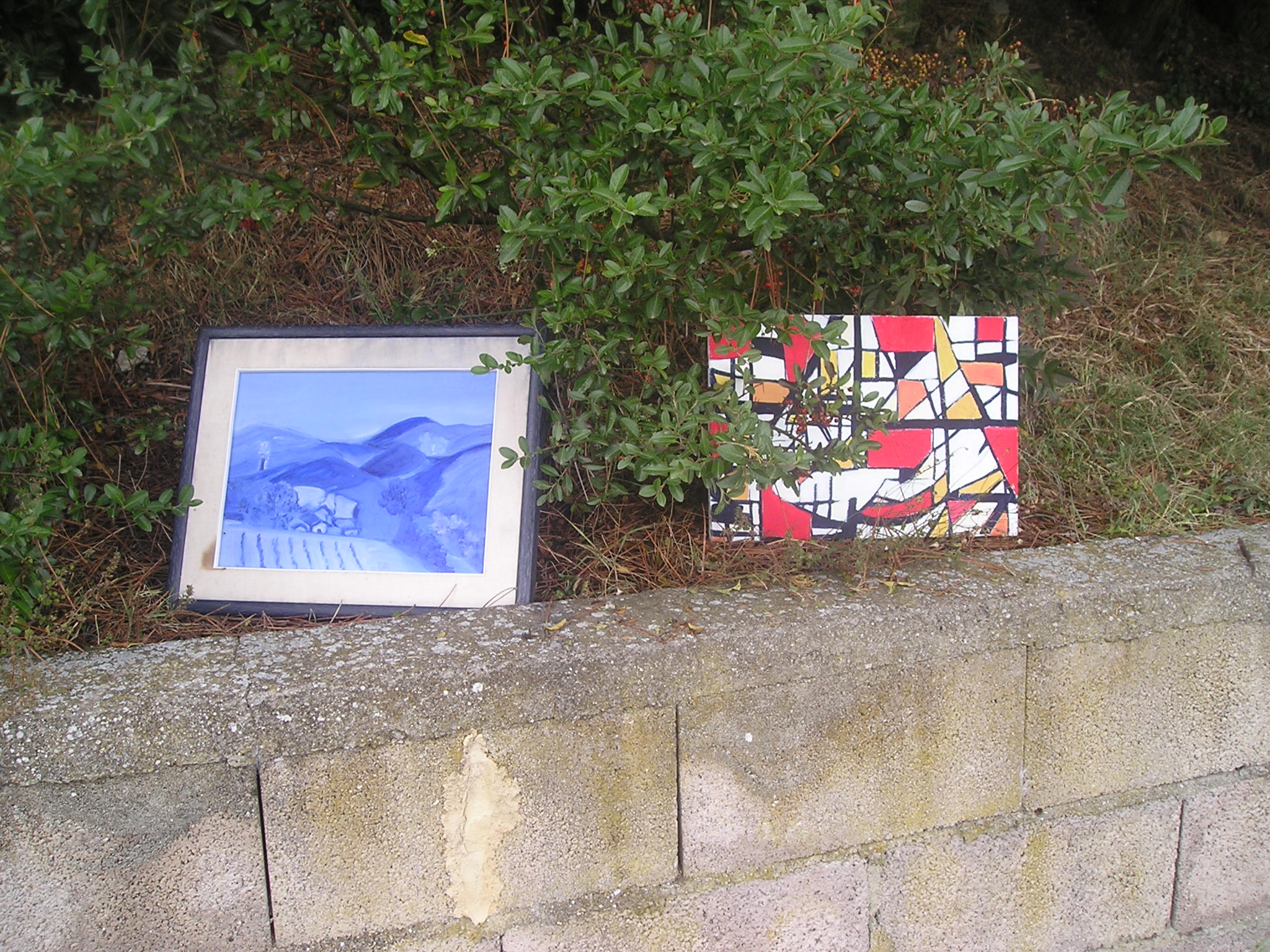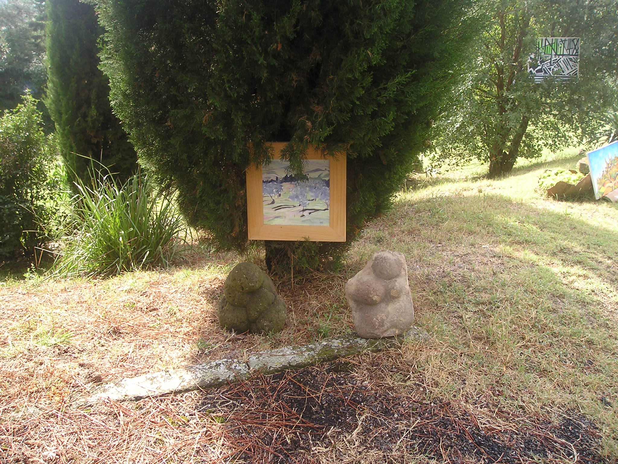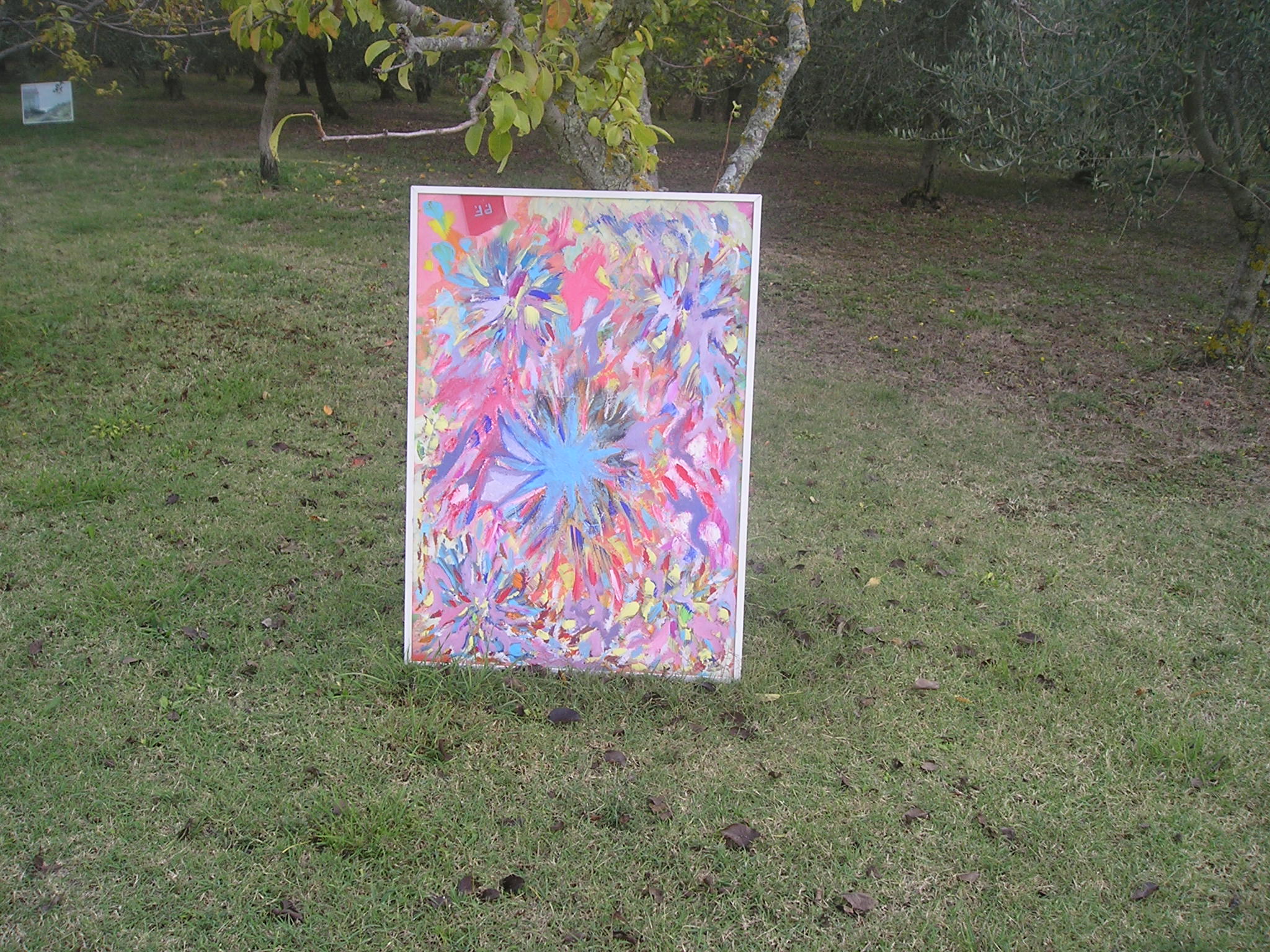 Il quadro ad ‘ulivi blu’, allungato e stretto fra i rami dei due cipressi del ‘Carducci’, sembra dischiudere un varco verso uno scorcio di paesaggio che non c’è.