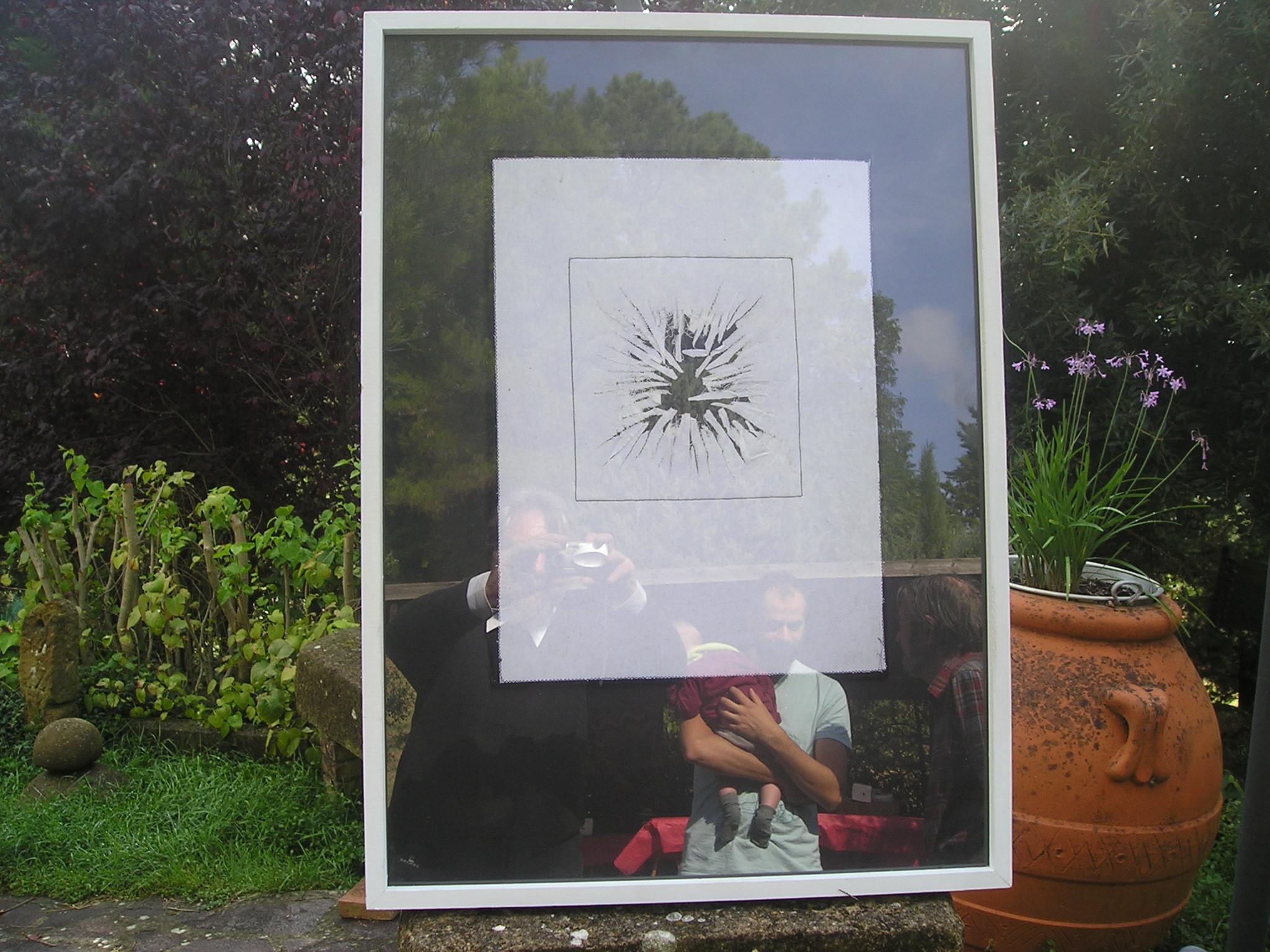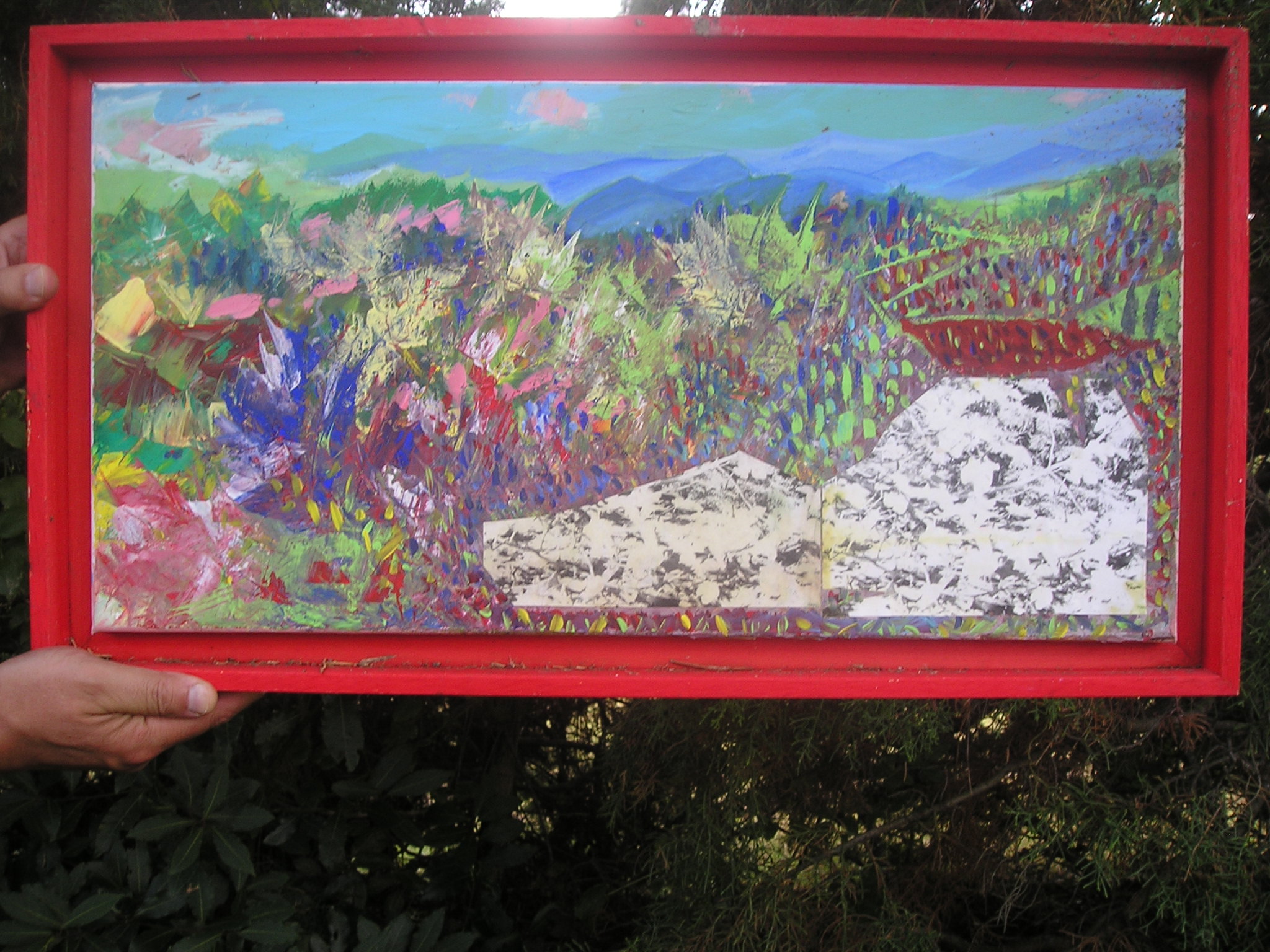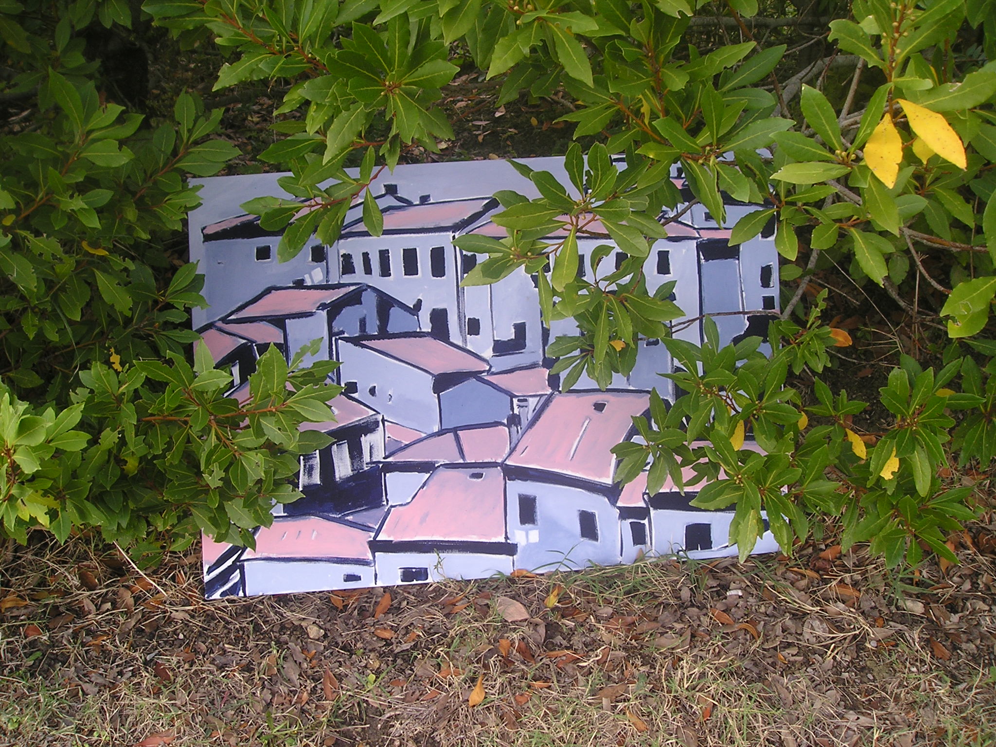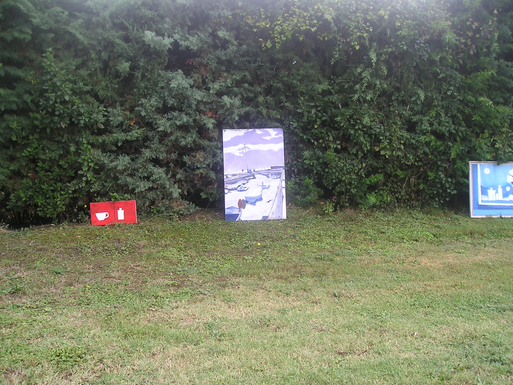 Il quadro ad ‘ulivi blu’, allungato e stretto fra i rami dei due cipressi del ‘Carducci’, sembra dischiudere un varco verso uno scorcio di paesaggio che non c’è.