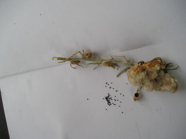 Oggi a fine Maggio quella piantina trapiantata in vaso (vedere il post PARTE SESTA), plausibilmente Mesopartes orontium , alta ormai 80 cm, ha abbondantemente fruttificato con capsule all’ascella delle foglie, rigide vuote contenenti centinaia di semini neri (max 1 mm) oblunghi (fra un fuso ed una palla da base-ball). In alto continua a fiorire. Le foglie, il caule ed i frutti si sono ricoperti di una fine lanugine grigia quasi fino alla cima (?). Un analogo riferimento è riportato anche nel post PARTE SESTA, lì dove si argomenta di questa pianticella. Vedere foto seguente.
