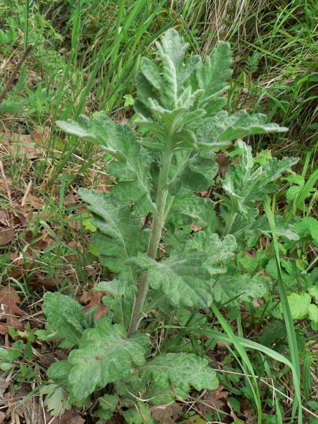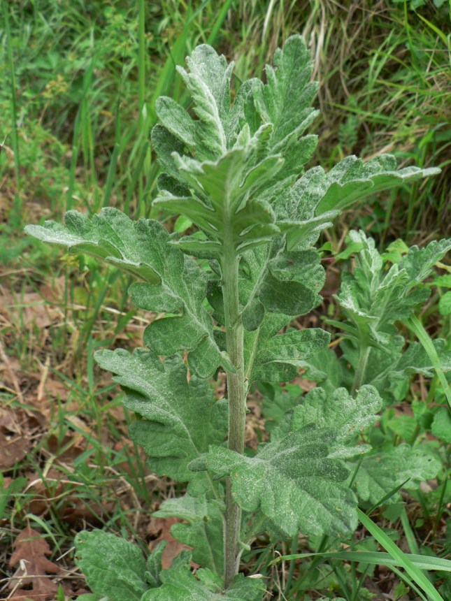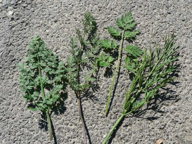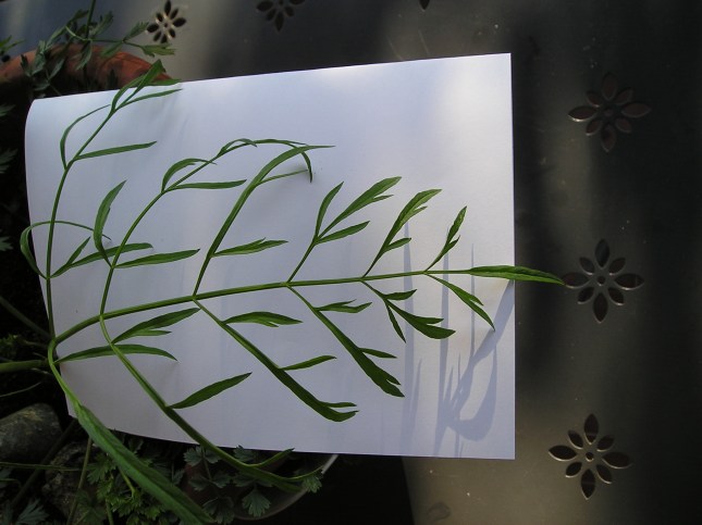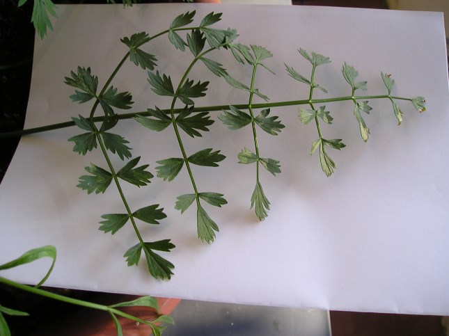 Come si vede dalle foto il butto centrale ha foglie con caratteristiche diverse da quelle basali laterali e si presume porterà alla cima fiori e infiorescenze, le sue foglie sono strette e lanceolate pennato sette. I lobi delle foglie iniziali (basali: livello zero) più rigide e scure (foglie davanti in basso della foto precedente, fotografate dopo anche ingrandite), sembrano più rotondeggianti e forse meno incisi delle successive (foto precedente caule a destra e la foto subito qui sotto), pur mantenendo la forma tendenzialmente romboidale. La forma dei fusti erbacei con le foglie è essenzialmente triangolare a ‘felce’.