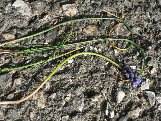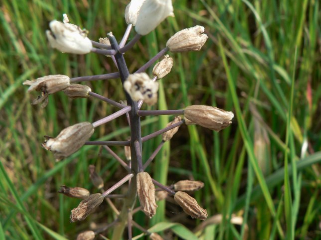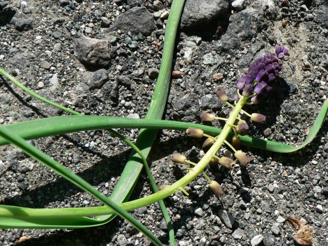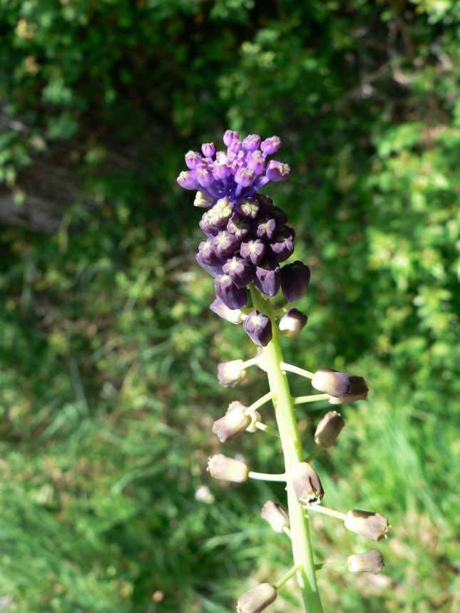 - Sulla dx, di fronte alla apertura che porta a S. Anna, nel cespuglietto della foto, (dove inizia una specie di viottolo che segue i campi) ho notato, anche se ormai a fine fioritura, un ‘Giacinto romano’: Bellevalia romana. Non è facile trovarne, è una piantina poco comune. E’ stata riclassificata tra le ‘Asparagaceae’.