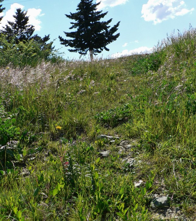 Sulla destra è posto la grossa pietra di calcare marnoso di ingresso a S. ANNA, nascosta dal cespuglio e si intravede appena la punta a destra; foto circa da ovest ad est