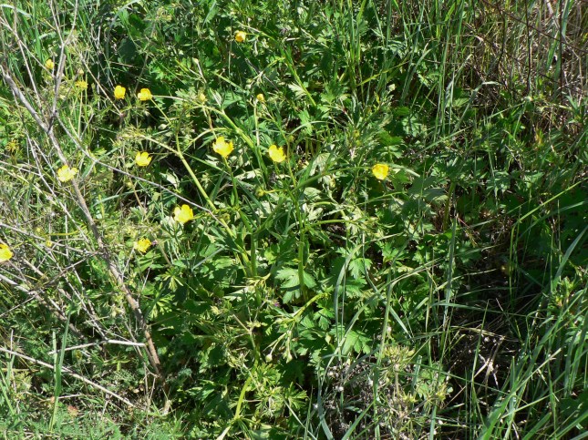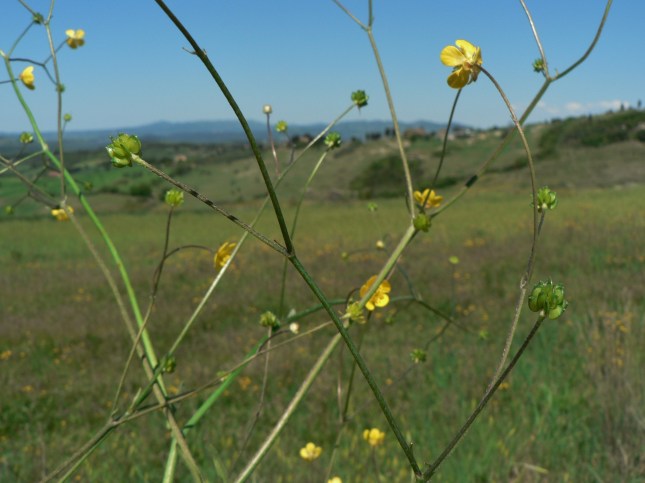 - Davanti al pelago ho osservato 2 specie diverse di Ranuncolacee. La prima con i fiori più grandi e consistenti si trova sul lato sx, nella fossetta proprio vicino alla rete del pelago. L’altra invece colonizza gran parte del campo di fronde sul lato dx ed ha ramoscelli e fiori molto più esili.