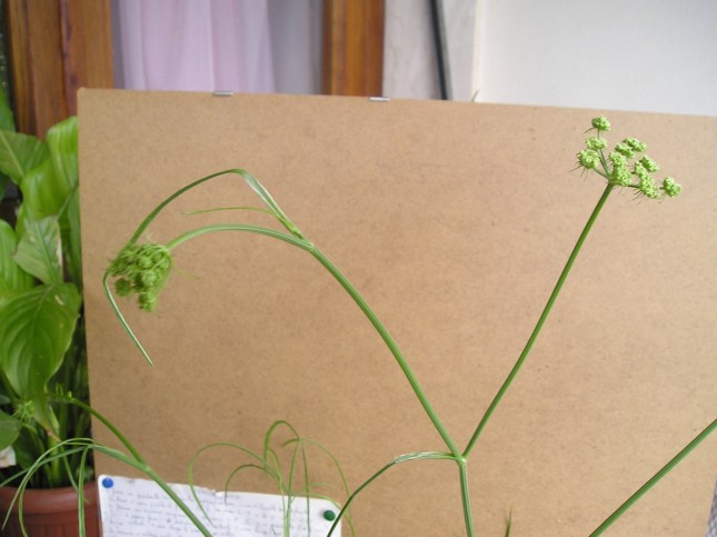 3 – Le foglie del secondo ordine, che prolungano la guaina come tutte, sono sempre più strette e lineari; subito prima delle gemme fiorifere, situate sempre sul prolungamento dell’ultimo segmento del ramo, le foglie sono diventate filiformi (foglie del quarto ordine); le gemme fiorifere, già apparse nella piantina dell’esperimento, stanno iniziando la fioritura in una ombrella semplice con una decina di peduncoli (vedere foto e schema):