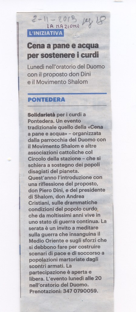 In questa ottica, il 12-11-2019 a pag. 18 della La Nazione, abbiamo potuto leggere di una iniziativa a favore del popolo curdo da tempo travagliato e tradito, descritta nel trafiletto riportato sotto: