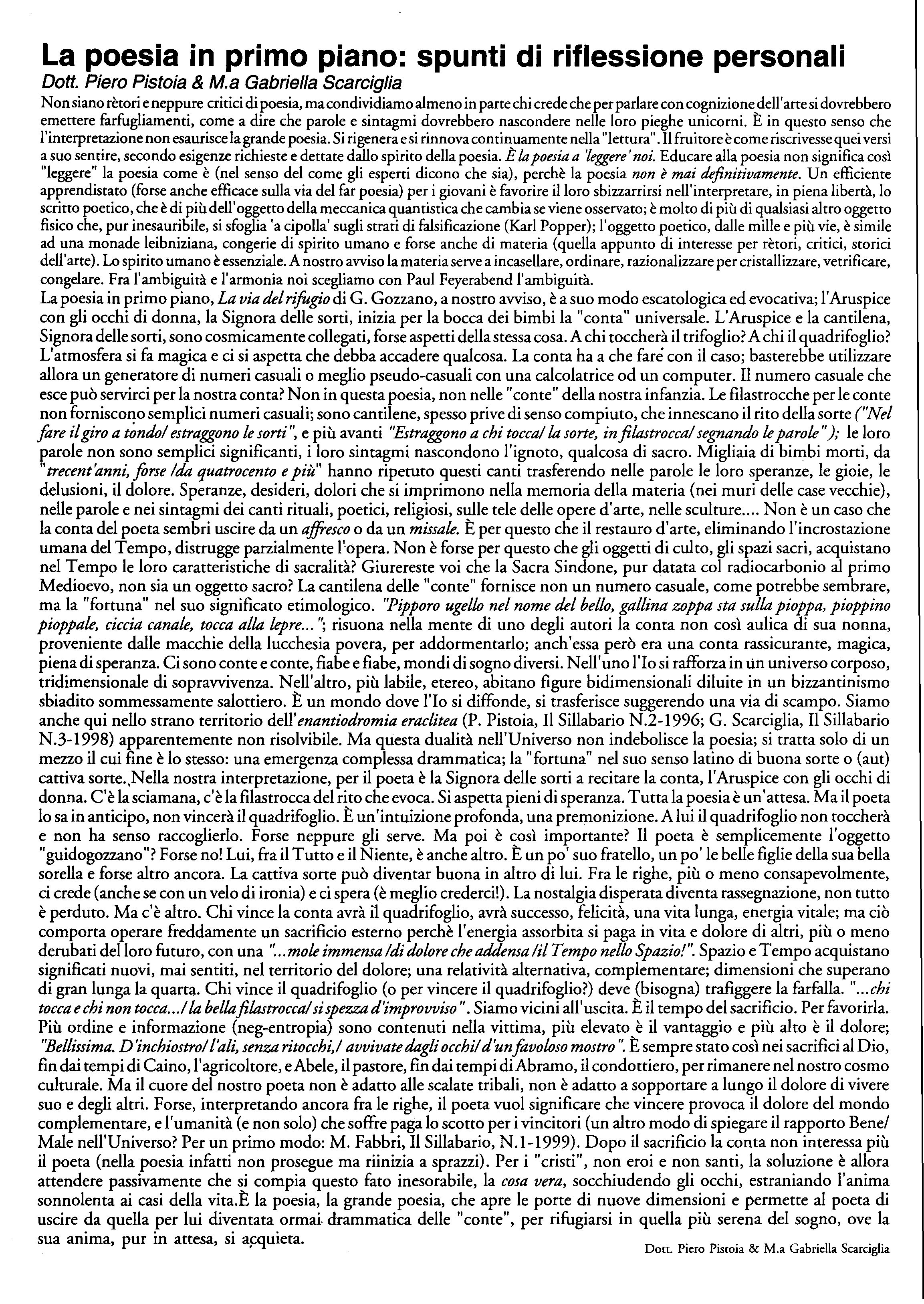 UNA POESIA DI GUIDO GOZZANO DELLA SUA RACCOLTA DI POESIE “LA VIA DEL RIFUGIO”, viene commentata, con spunti di riflessioni personali, “forse” fuori dalle righe (farfugliamenti emotivi che si dipanano lungo un filo razionale) per attivare un possibile dibattito alla frontiera; docenti Piero Pistoia e Gabriella Scarciglia