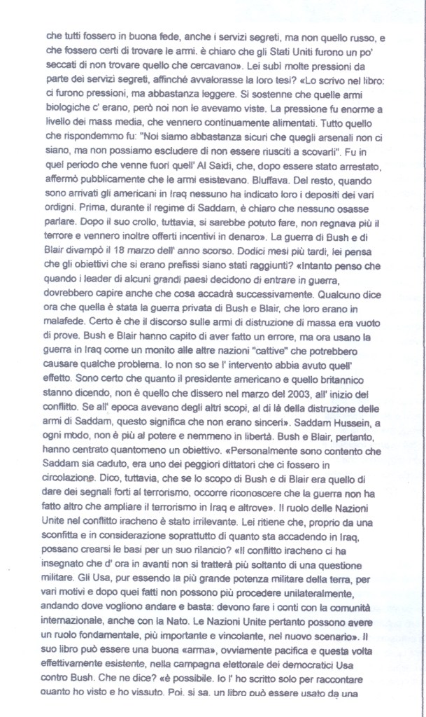 1 – per leggere un articolo sulla relazione del Presidente della Commissione di Controllo sulle ipotetiche armi chimiche di Saddam, cliccare sul link per leggere l’art. di Massimo Novelli, giornalista della REPUBBLICA in pdf: