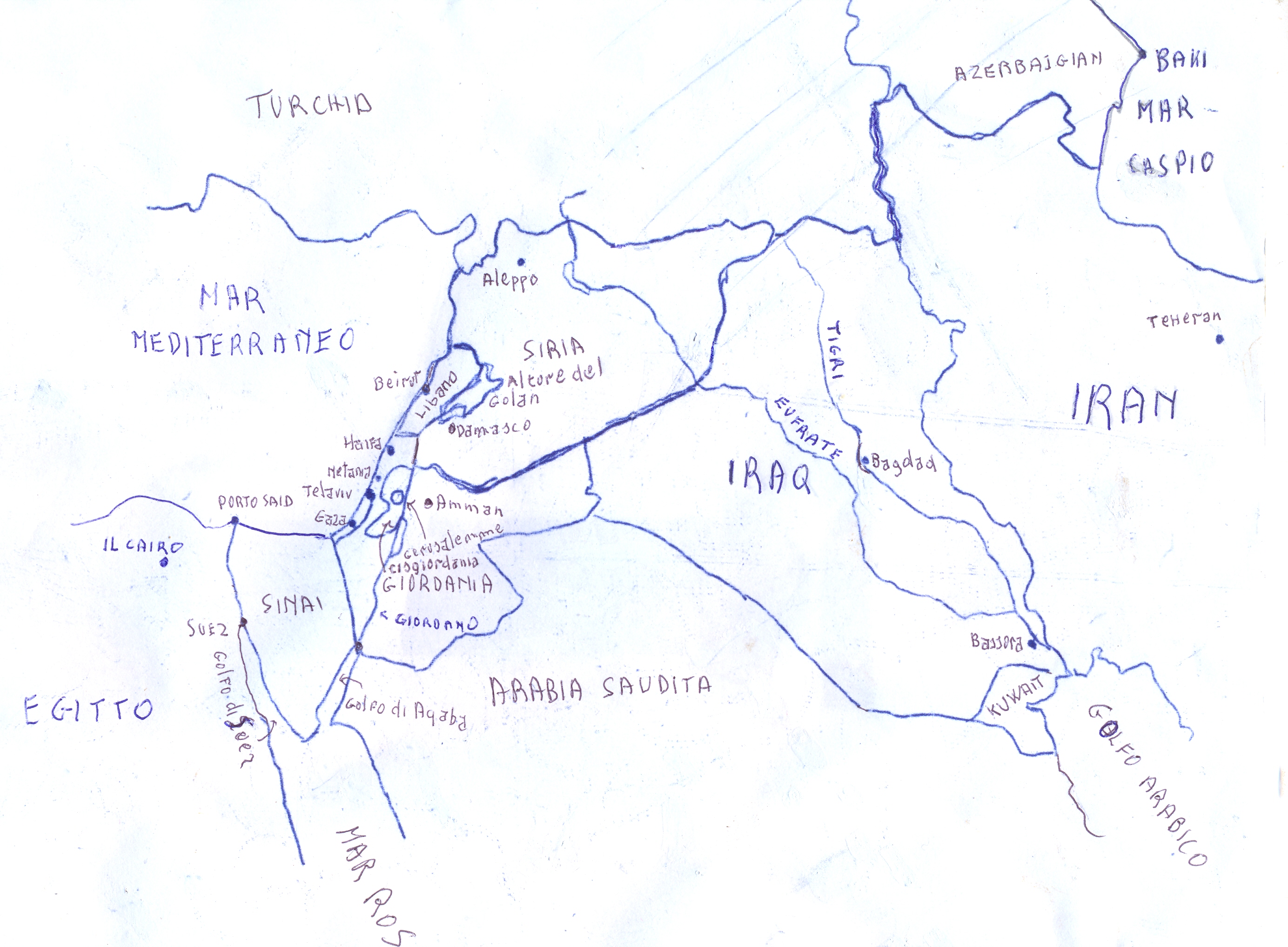 Dallo schema ‘impasticciato’ che segue, da notare che il confine ad est di Israele coincide circa col fiume Giordano che, proveniente dal Libano, entra come immissario nel Mar Morto, circa alla stessa latitudine del sud della Cisgiordania e di Gaza e riesce come emissario sfociando nel golfo di Agaba nei pressi della città di Elat.