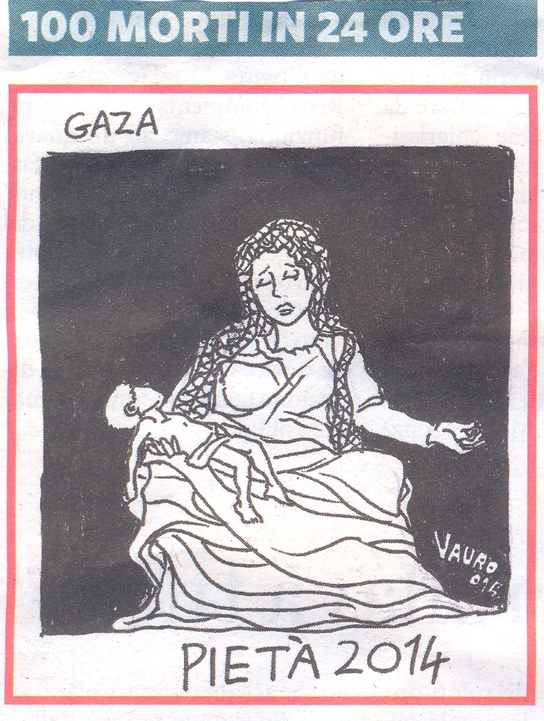 Seguono le ultime due sculture di Marmelli in arenaria che esprimono il dolore di una madre per la perdita del figlio ucciso, suggerita dagli inumani drammi in atto nel Mediterraneo: dai tragici sbarchi di migranti fuggitivi a Lampedusa, o forse dall’attuale ‘eccesso di difesa’ ‘asimmetrico’ (da una parte la paura senza conseguenze, dall’altra la morte certa!), incredibile in Medio Oriente, che, a mio avviso, lascerà traccia nella Storia e nella memoria delle genti, perpetrato dalle guerre. Col tempo infatti le guerre continuano ad acquistare sempre più intensamente questa caratteristica a danno dei più deboli e dei più poveri. E’ stato ucciso un combattente occidentale! urlano costernati i mass media. Possibile che, nelle ultime guerre, nessuno abbia fatto il conto di quanti bambini, quante donne non combattenti, quanti vecchi, in media, riescano a bilanciare questa morte?! Si veda in proposito anche la vignetta emblematica successiva ripresa dal giornale ” Il Fatto Quotidiano” del 30 luglio 2014.