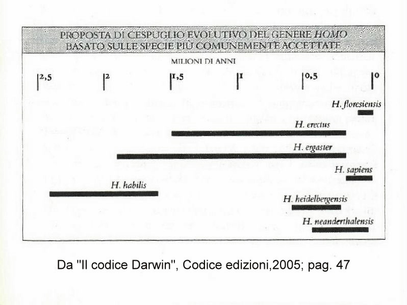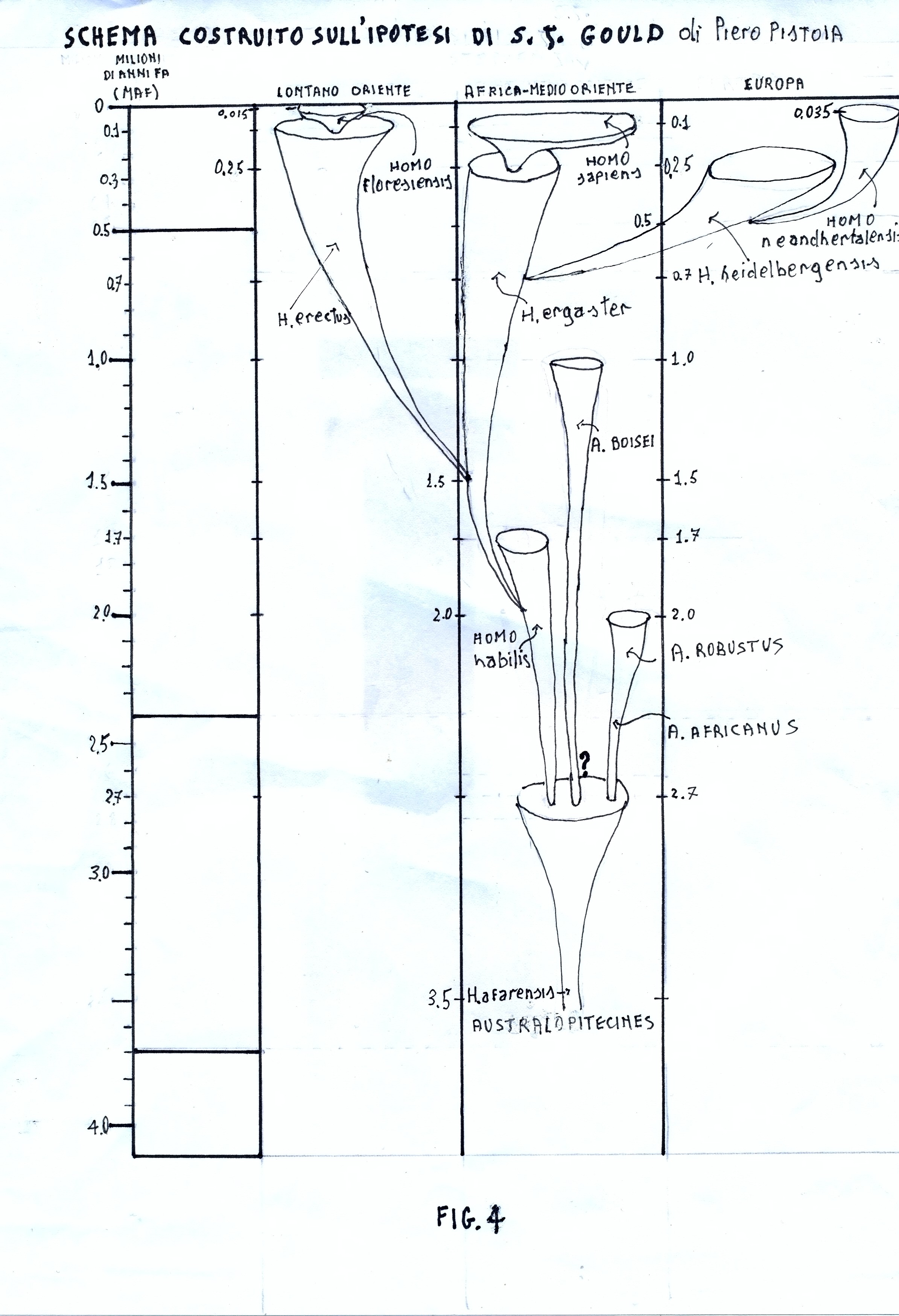 Nella evoluzione umana invece di invocare per lo più un lento ed inesorabile cambiamento di una specie longeva e ubiquitaria (albero con pochi rami), subentrò la convinzione di una convivenza di specie diverse (cespuglio evolutivo), che nel corso della loro vita sarebbero rimaste per la maggior parte del tempo immutate (albero filetico ramoso). Oggi si tende di nuovo a ‘potare’ di qualche ramo l’albero filetico del genere Homo. Per sapere più in profondità di quello che abbiamo scritto e di queste tendenze leggere “Il codice Darwin” di G. Biondi e O. Rickards, Codice Edizioni, Torino, 2005 e “Le origini dell’uomo” A. V., Le Scienze, 2005. – Nominando solo le specie più comunemente accettate, l’albero filetico dell’Homo, con radici africane (vedere figura sotto PROPOSTA DI SCHEMA DEL GENERE HOMO, di Gould), alla base è costituito plausibilmente da H. habilis, che visse in Africa e la colonizzò fra quasi 2.5 e 1.6 MAF.
