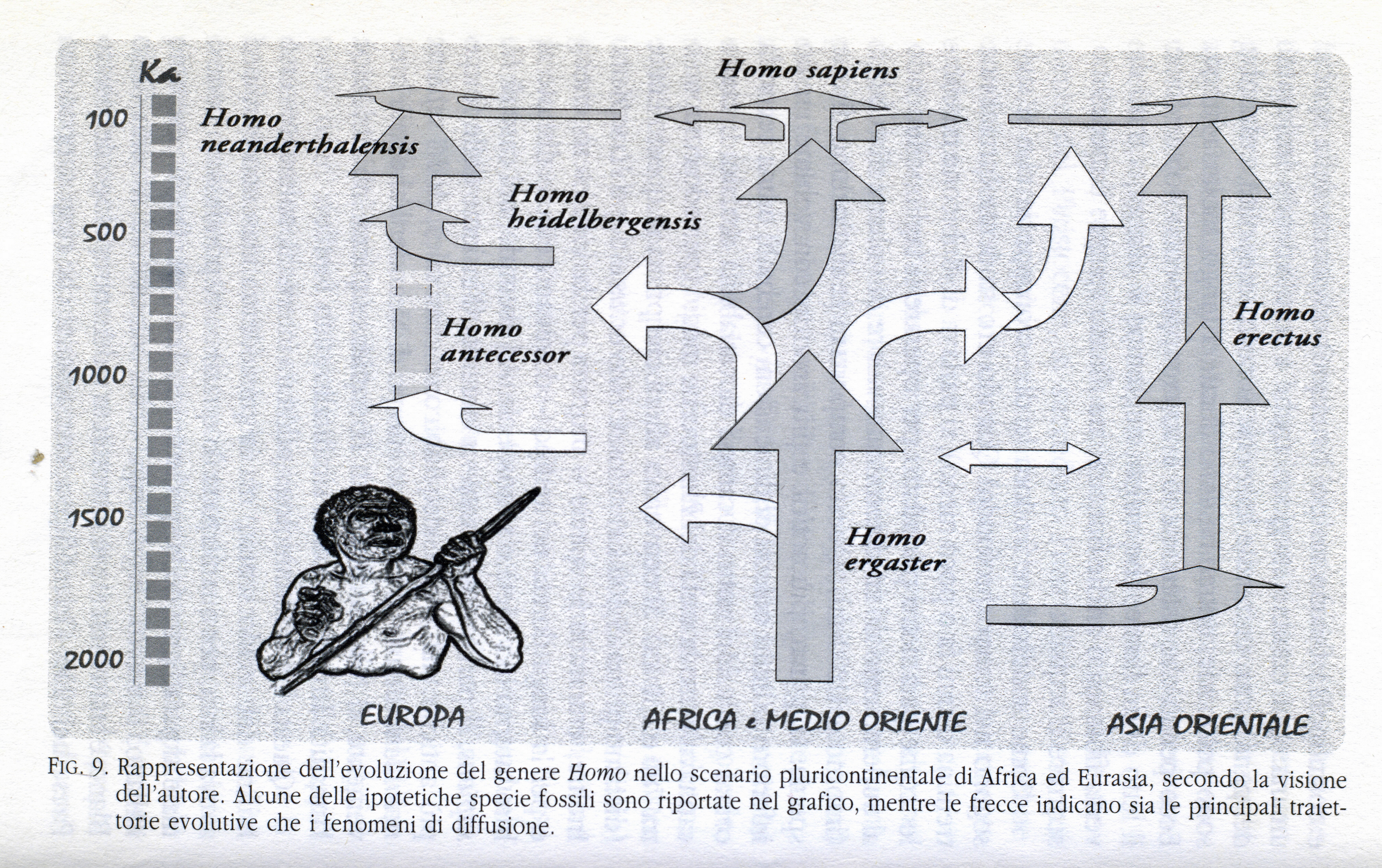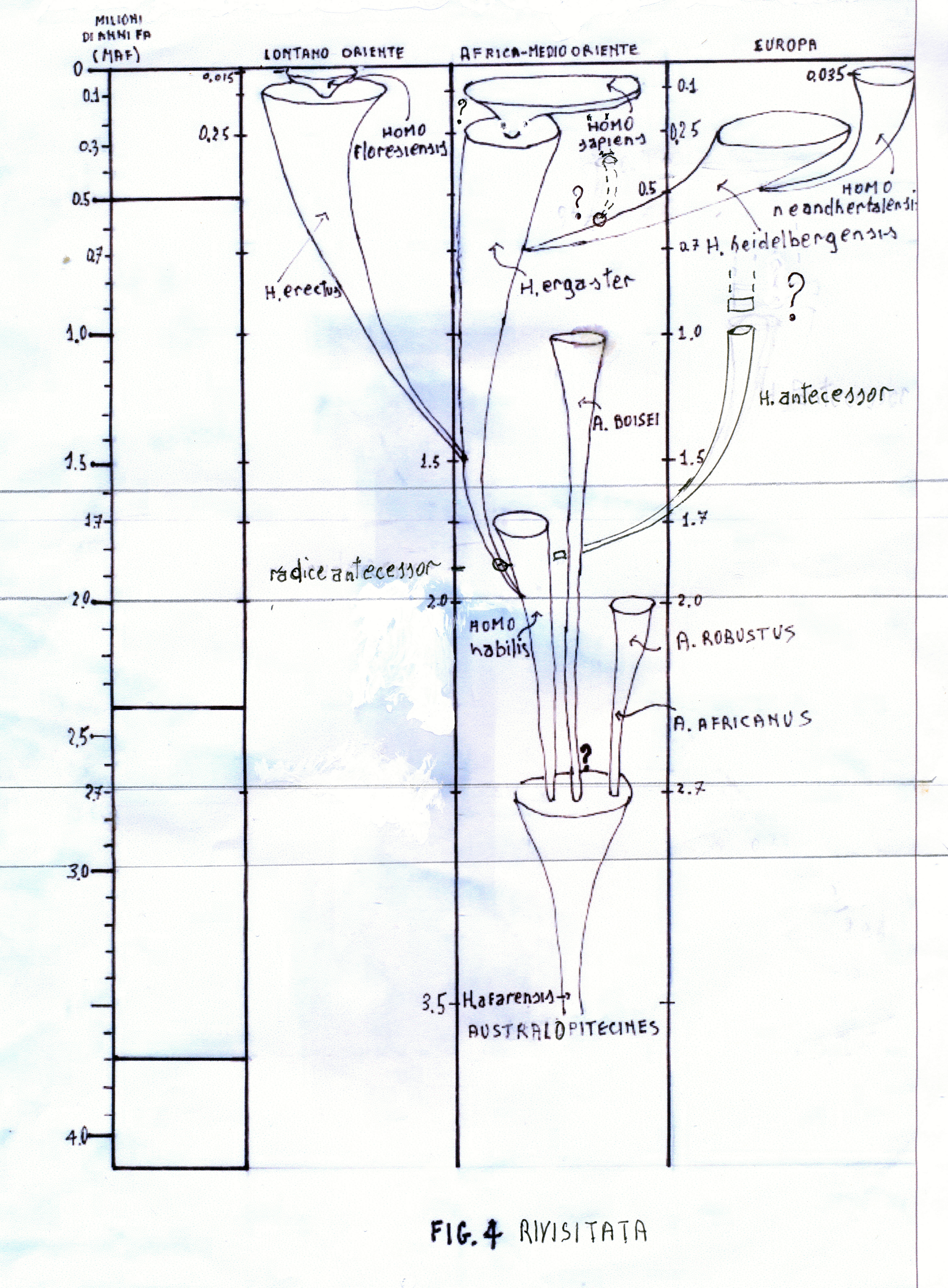 – Dapprima si pensava che i più antichi fossili degli ominini scoperti in Europa avessero un’età intorno ai 7-800mila anni (ancora prima solo di circa 500ka). Ora, con le nuove scoperte di fossili e loro datazioni, si sono moltiplicati i casi di una popolazione molto più antica (1.2-1.3 Maf), in particolare in Spagna nel sito di Atuaperca. Seguire sulla FIG. 4 RIVISITATA. Così sembra che in Europa ci siano state almeno due diffusioni dall’Africa a partire dall’ergaster africano sfasate nel tempo: una, più antica, dell’antecessor (radice: 1.5 MAF o più antica) e l’altra successiva dell’heidelbergensis (radice: intorno a 700ka), ambedue appunto dal ‘tronco’ dell’ergaster africano, ma, nel secondo caso, ormai già evoluto al modo 2. Gli ominidi europei del ramo più antico, es., della Spagna, H. antecessor, di Cultura Oldowaiana, (MODO 1), di lontana radice africana sul ‘tronco’ dell’ergaster antico, (es., strumenti litici di Bibbona, Tuscany, Italia, circa 730ka), nel procedere della loro evoluzione e diffusione verso est, potrebbero aver prodotto alcuni gruppi successivi, per es., anche al centro e nel sud Italia, (del tipo, per es., uomo di Ceprano, Argil, di almeno circa 400-450mila anni fa), e quindi contemporanei agli heidelbengensis diffusi dall’Africa, presenti in Europa a partire da 0.5-0.6 MAF. Tali gruppi, posti come discendenti sulla antica linea filetica dell’ergaster dell’Oldowaiano (cioè H. antecessor europeo) di radice lontana africana (diffuso verso l’Europa circa 1.5-1.6 MAF), per ipotesi, potrebbero essere precursori di qualche comunità o popolazione dell’altra linea dell’ heidelbergensis di MODO 2 (già nominata come diffusa dalla radice africana sull’ergaster, circa 0.7 MAF; presente in Europa a partire da circa 0.5-0.6 MAF), vista la grande variabilità all’interno delle specie umane (si pensi che un Pigmeo ed un Masai sono ambedue sapiens)? (Ma nel ‘quattrocentomila anni fa’, al tempo delle popolazioni simili al fossile di Ceprano, esisteva in Italia l’heidelbergensis di origine africana in evoluzione! Quindi, meglio, questi gruppi potrebbero essere i precursori di una forma italiana dell’heidelbergensis? Segue argomentazione sull’ipotesi. Da chiarire. (da rivedere!)