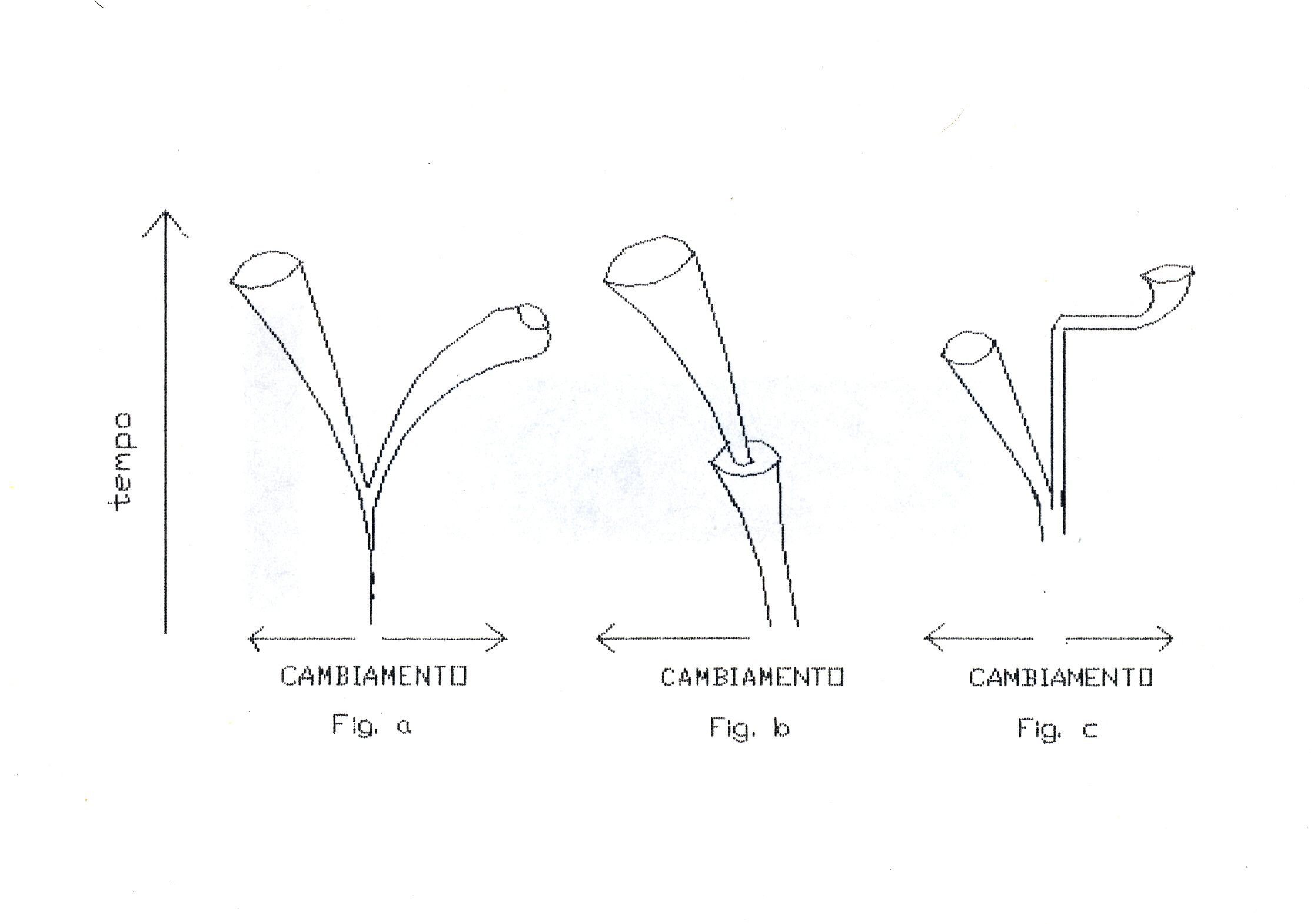 1 – Una parte della popolazione, per esempio, periferica e marginale, procede evolvendo in una direzione diversa dal resto; dopo un certo tempo potremo avere due gruppi contemporanei diversi, imparentati da un progenitore comune; si ha così una diramazione col successo probabile di uno solo dei rami (Fig.1a).