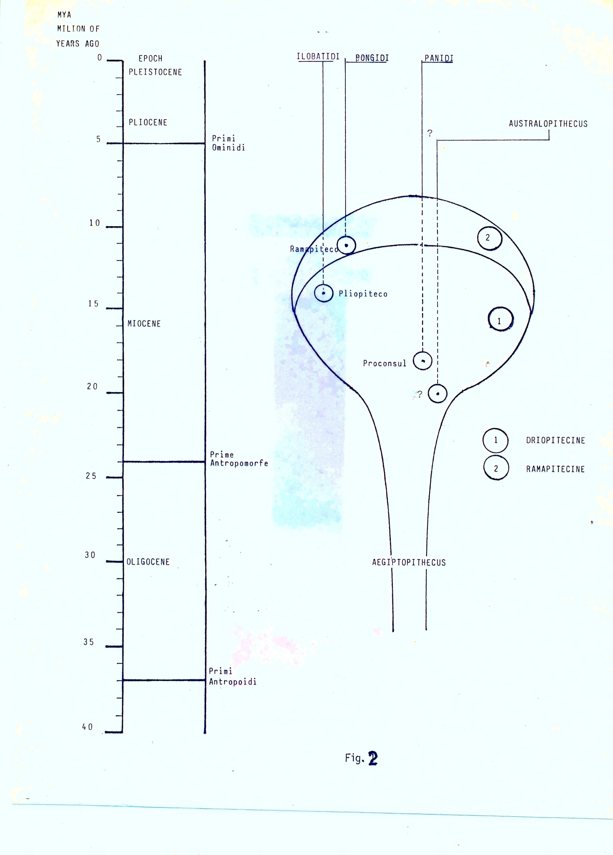 Alcune decine di anni fa Leakey (13) e Coppens (2) ritenevano che la separazione degli Ominidi dalle Antropomorfe fosse avvenuta in Africa Orientale e risalisse al Miocene Medio (almeno 12-14 MAF). Da quel momento si sarebbe formata una linea evolutiva, a partire da qualche forma ramapitecina ( es., Keniapithecus wicheri, il più scaltro (?) fra i Ramapiteci) tendente verso la forma umana, parallelamente alle altre forme allora viventi. Rimaneva così un intervallo vuoto di milioni di anni prima dell’apparizione di forme a stazione eretta simili all’uomo. E ancora, escludendo dalla linea dell’Uomo i Ramapiteci più specializzati e accettando con Lumley (3) che nel”Miocene l’evoluzione delle Antropomorfe è praticamente conclusa con l’adattamento perfezionato alla vita arboricola”, la popolazione origine del phylum umano, dello stesso ceppo dei Panidi, doveva essere ricercata prima della specializzazione delle Driopicine, quindi più di 20 MAF (Fig.2), in forme periferiche e poco numerose che vivevano al limite della foresta, forse vicine ai Proconsoli.