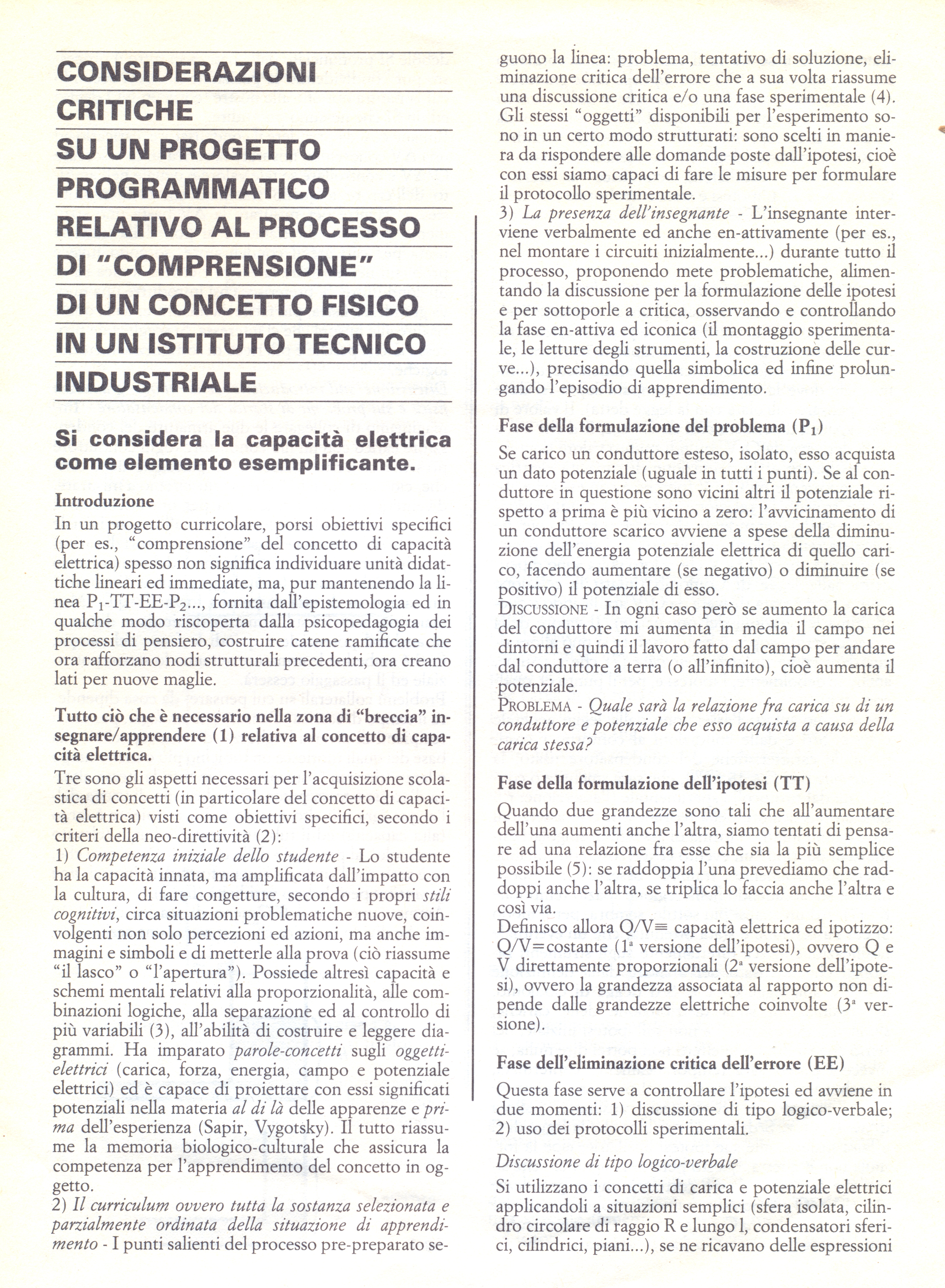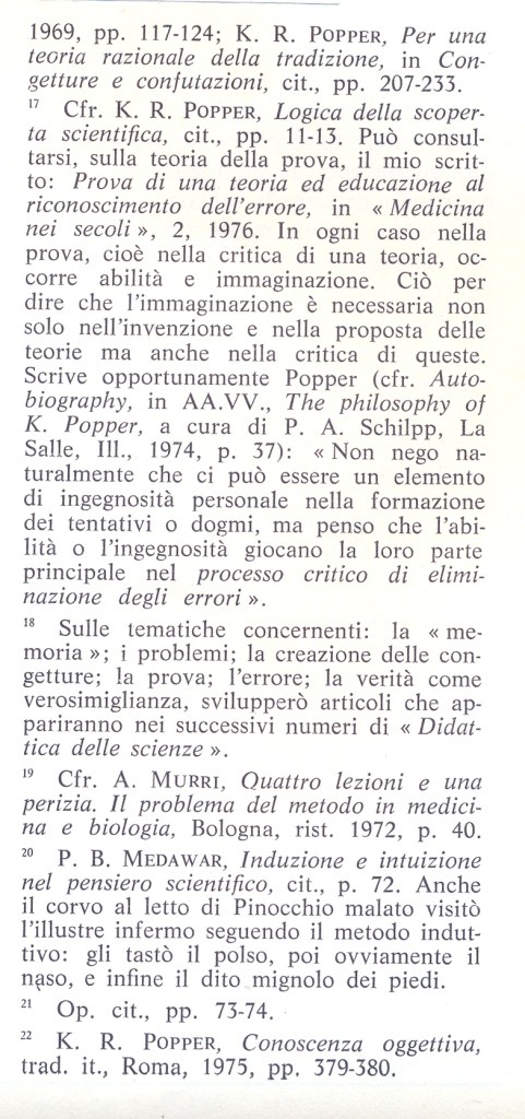 Nella fase EE si risolve il processo di falsificazione, che <<necessariamente tocca>> il Reale, il mondo, la Natura, come privazione, tramite l’argomentazione critica o il laboratorio, sia esso standard oppure offerto dalla Natura. Per ulteriori approfondimenti vedere, per es., K. R. Popper, Epistemologia, razionalità e libertà, Armando, 1972,pp.23 e seguenti;, pp 107-108; K. R. Popper, Tutta la vita è risolvere problemi, Rusconi, 1996, cap. I; Per l’applicazione della sequenza proposta alla didattica, P. Pistoia, La teoria dell’errore e l’uso del computer in laboratorio, in <<Didattica delle Scienze>> n. 132, novembre 1987.