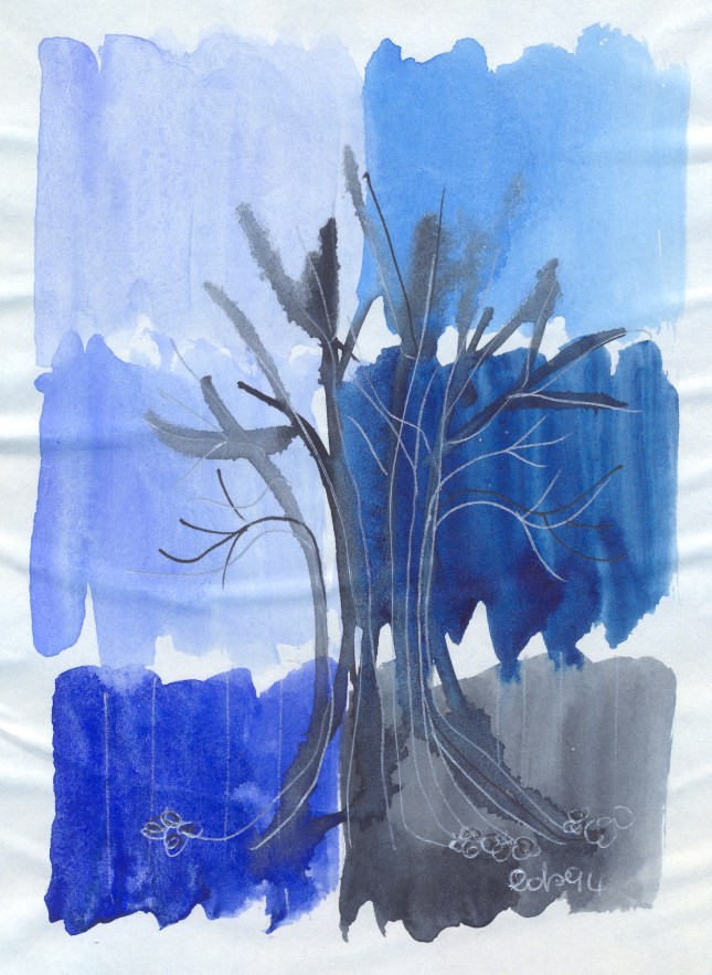 Il quadro ad ‘ulivi blu’, allungato e stretto fra i rami dei due cipressi del ‘Carducci’, sembra dischiudere un varco verso uno scorcio di paesaggio che non c’è.