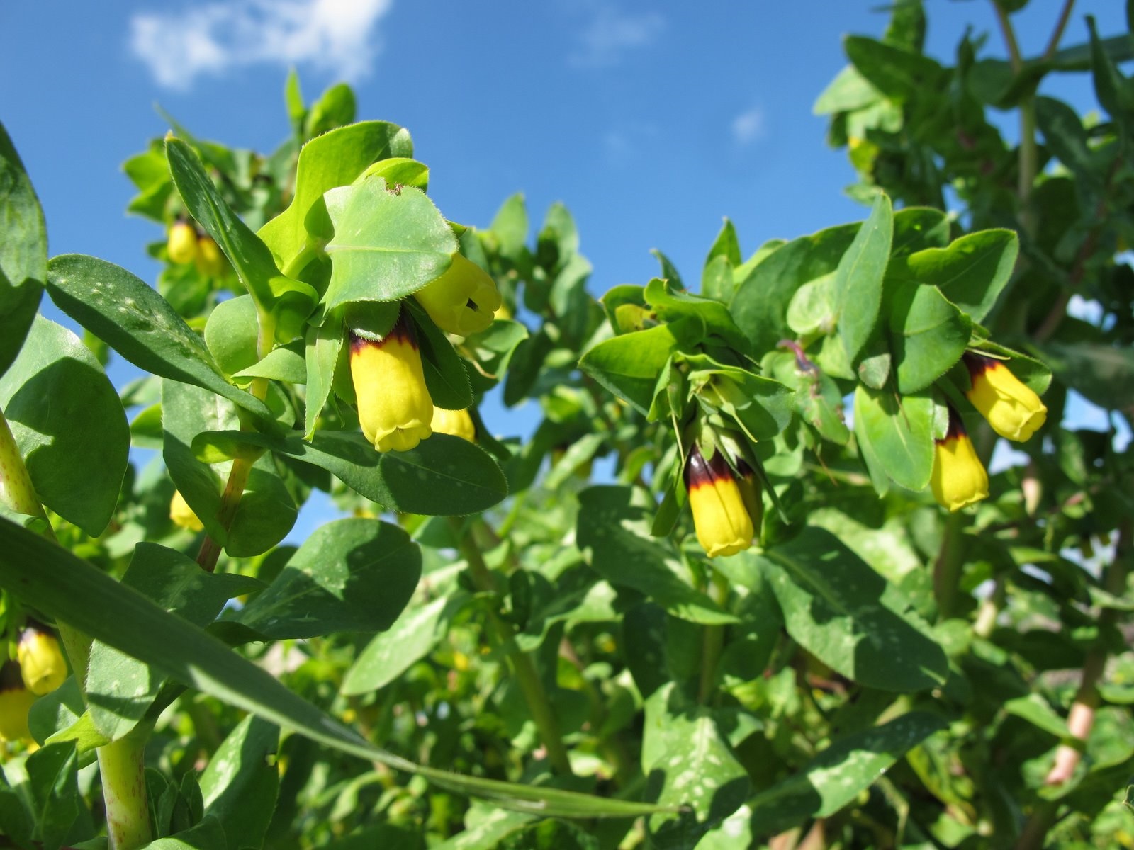 Ecco la nuova piantina ‘puzzolente’ che sta crescendo; una Labiata (=Lamiacea) con foglie forse (se è affidabile il ricordo) simili in forma a quelle della Melissa profumata o delle mente selvatiche; è stata fotografata sul poggio del Ponso, vicino alle  rosette di Cerinthe (le foglie sono di fatto più scure e risultano un po’ schiarite dal flasch).