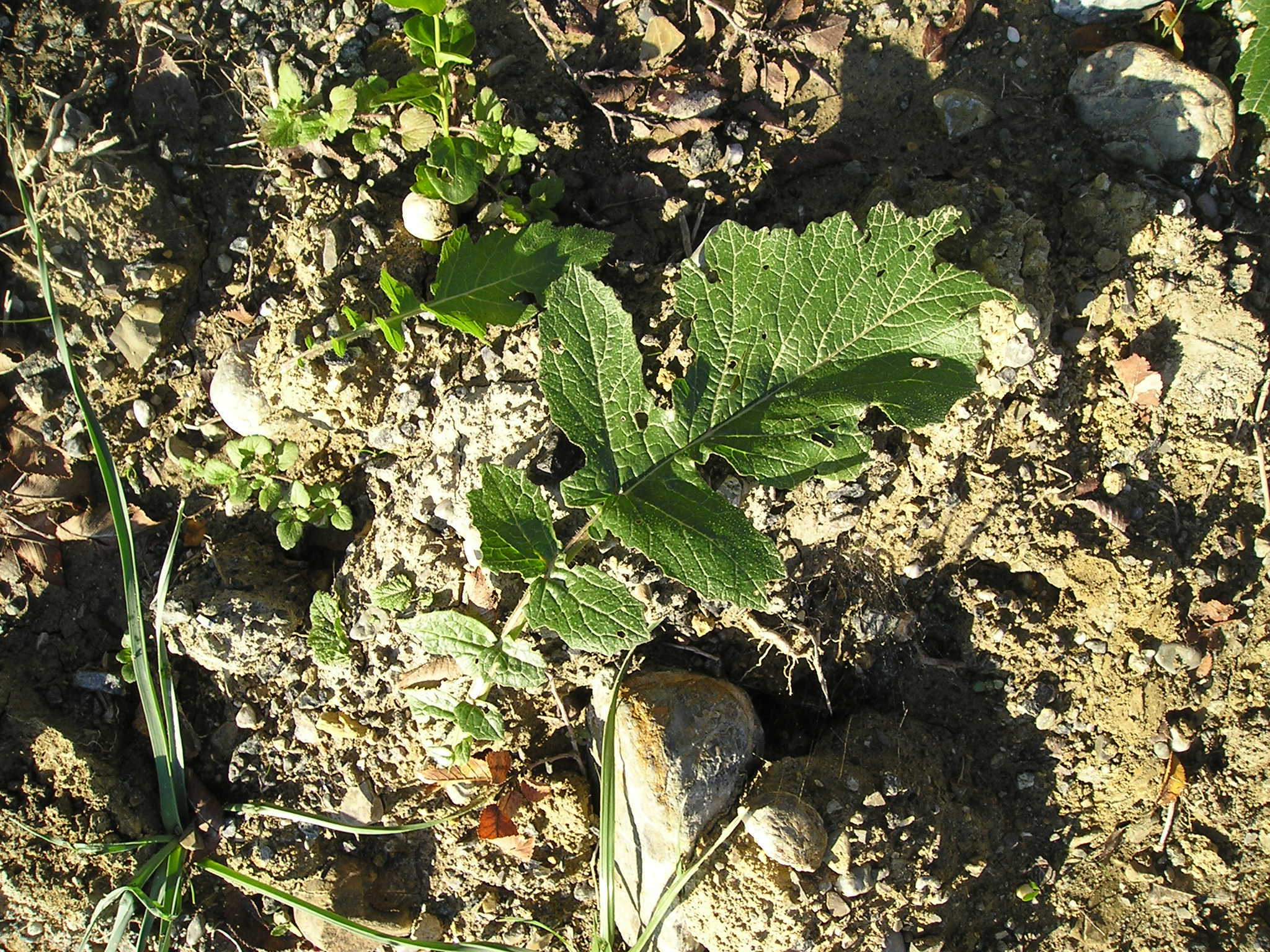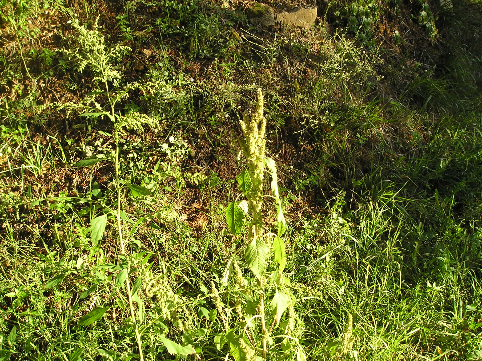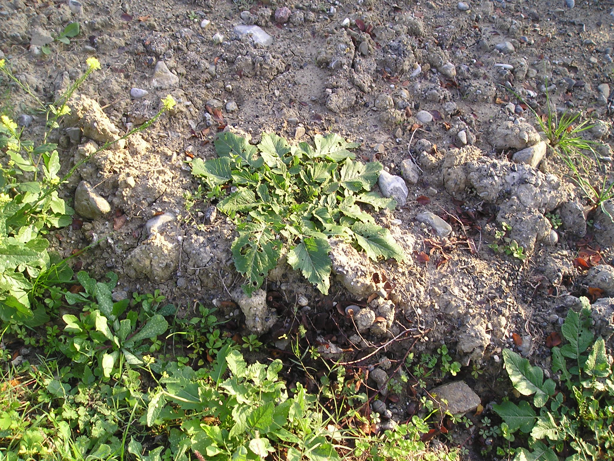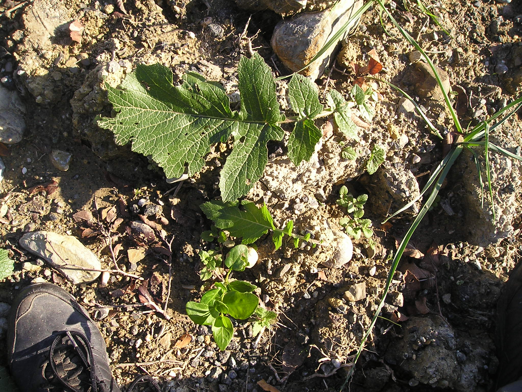 Insieme alla rosetta di base  a lamine ovate si notano: a sinistra in basso Il Chenopodium album fiorito (Farinaccio), La Mercurialis (Mercurella), tracce di erba di campo e in alto una specie di ”liana’ strisciante ….ed altro