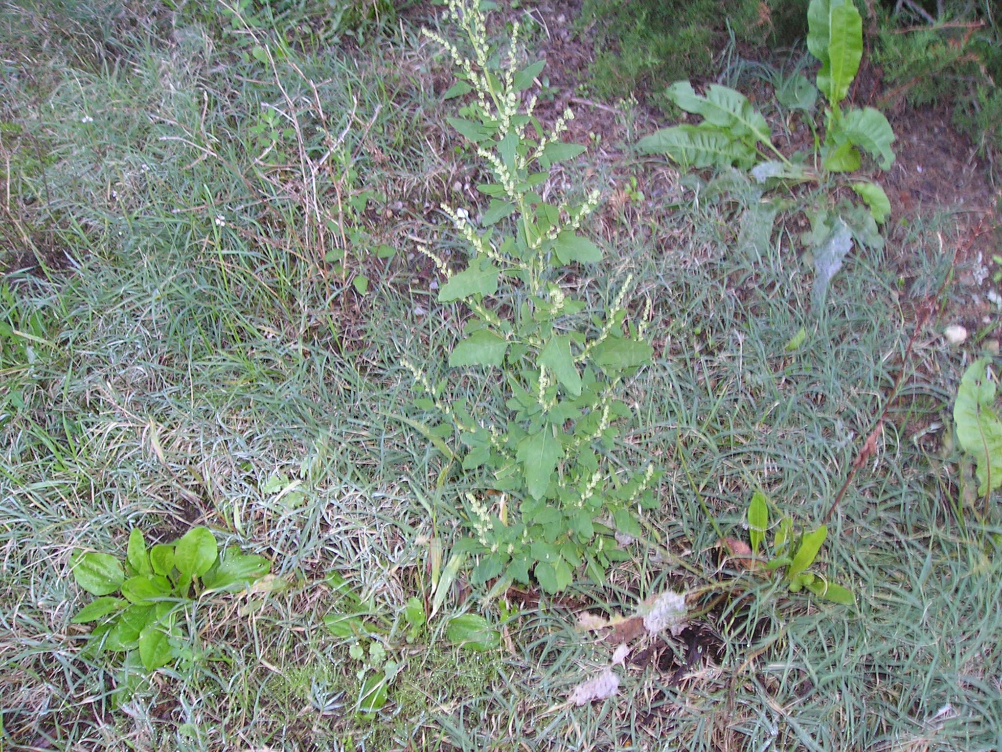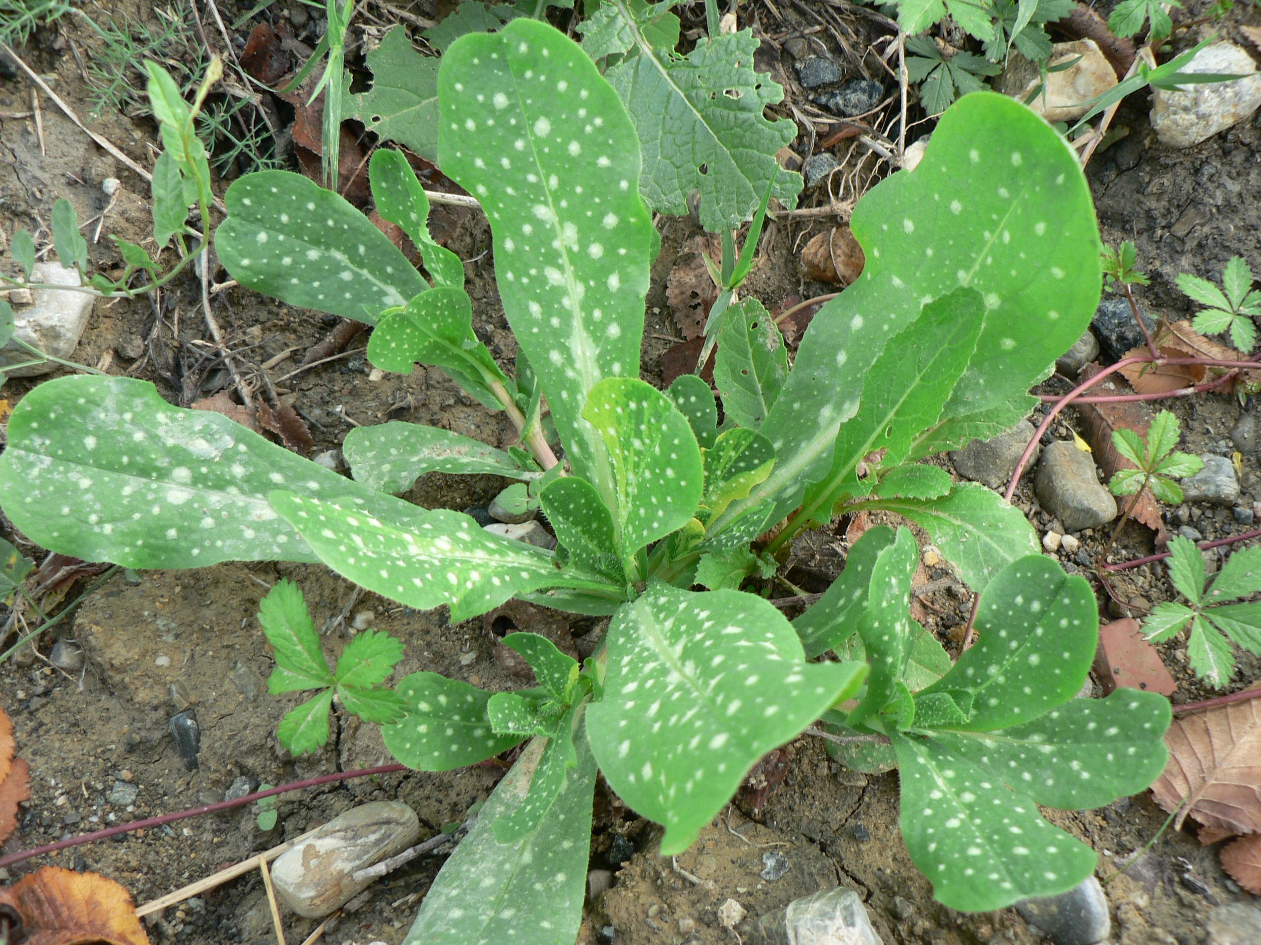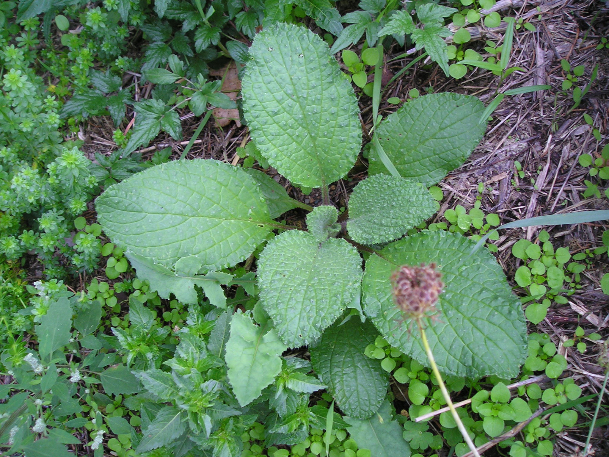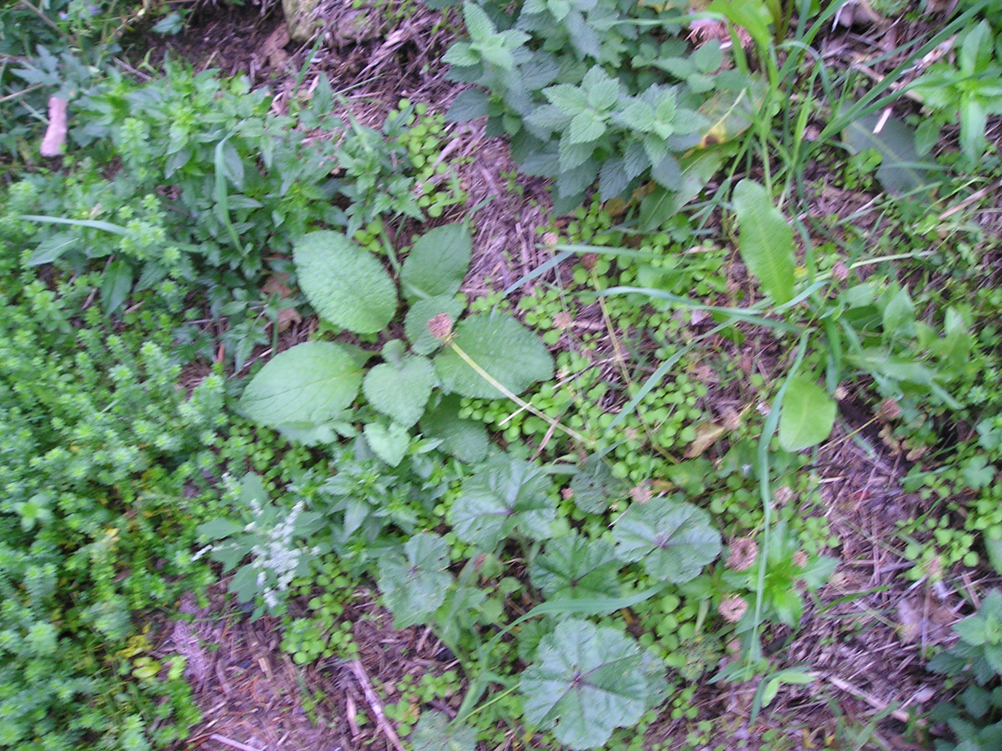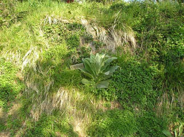 Insieme alla rosetta di base  a lamine ovate si notano: a sinistra in basso Il Chenopodium album fiorito (Farinaccio), La Mercurialis (Mercurella), tracce di erba di campo e in alto una specie di ”liana’ strisciante ….ed altro