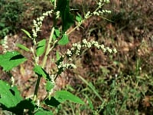 Caratteristiche della Mercurialis annua: si notano piccoli fiori verdicci e insignificanti, unisessuali portati da piante separate (piante dioiche). I fiori maschili ridotti a un perianzio rudimentale, che  circondano una decina di stami, sono raggruppati in glomeruli e aloro volta riuniti in spighe lasse. I fiori femminili anch’essi di scarsa rilevanza sono riuniti in gruppetti all’ascella delle foglie.