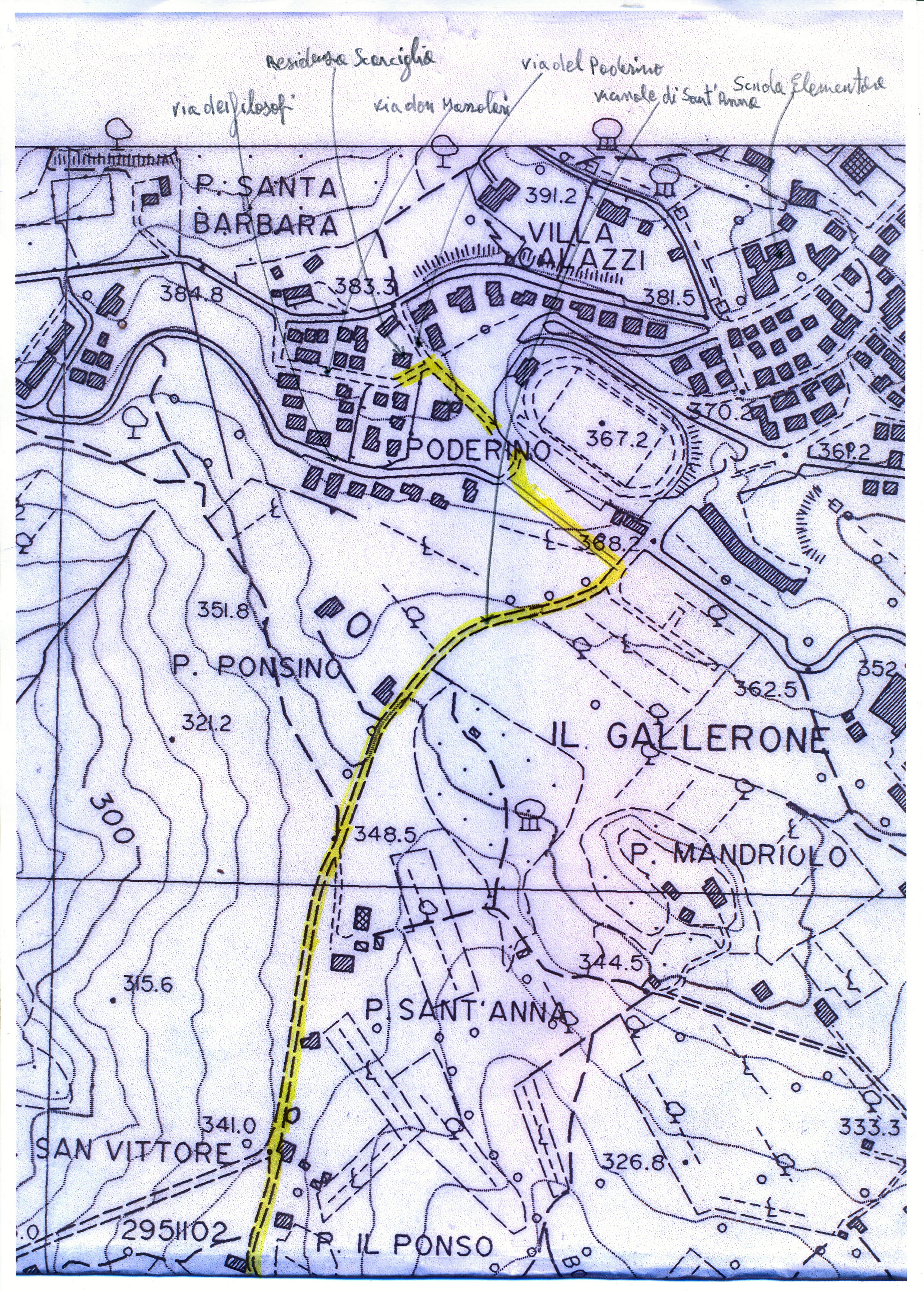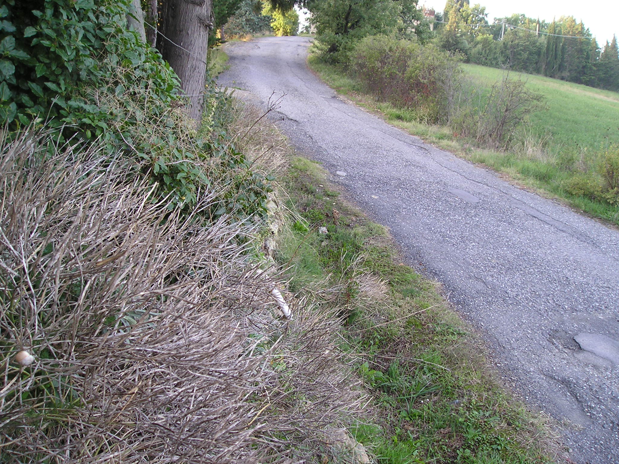 L’argine del P. San Vittore su cui esistevano in luglio le achillee in fiore, ricresciute in rosette nel fossetto alla base, oggi in Ottobre. Ingrandendo si nota ancora qualche ‘corimbo’ rinsecchito di Achillea. La strada sale sul poggetto del Ponso.