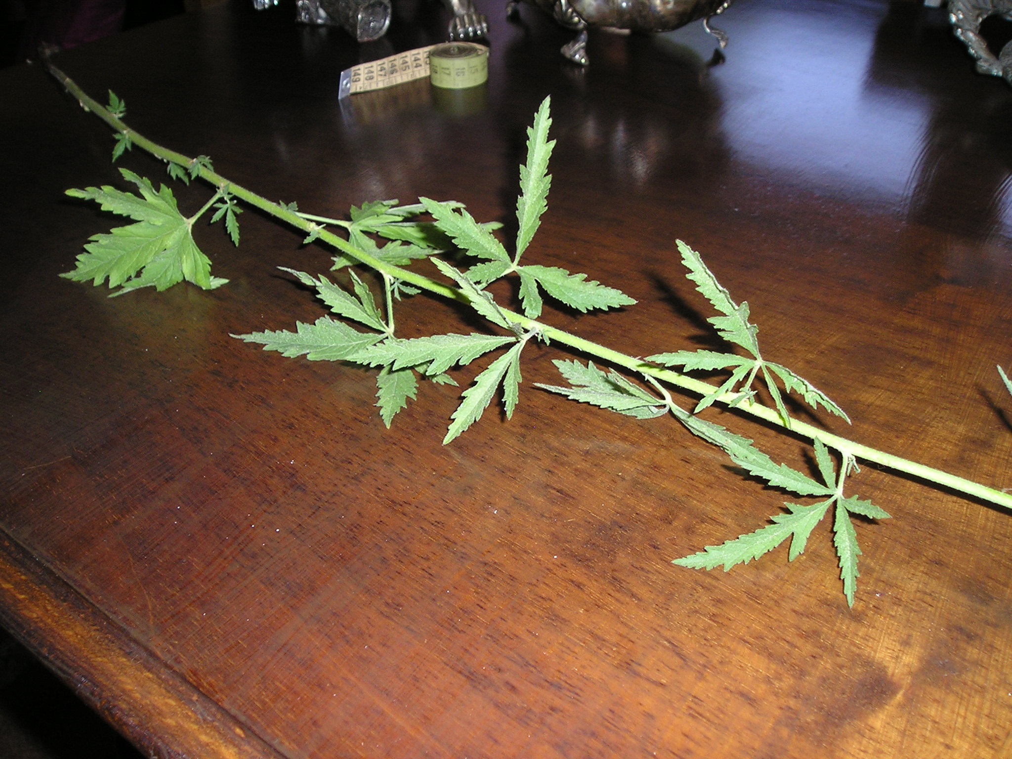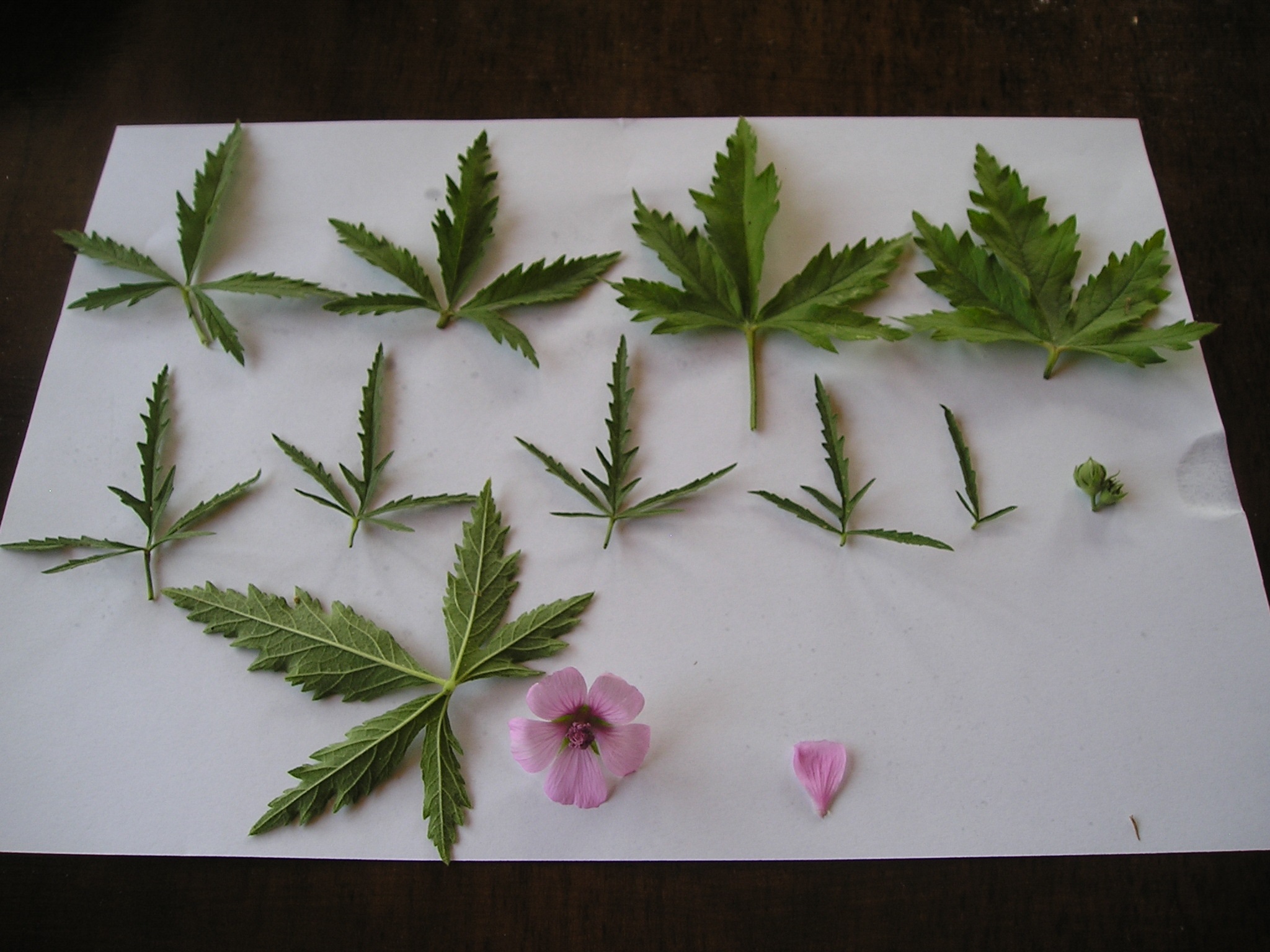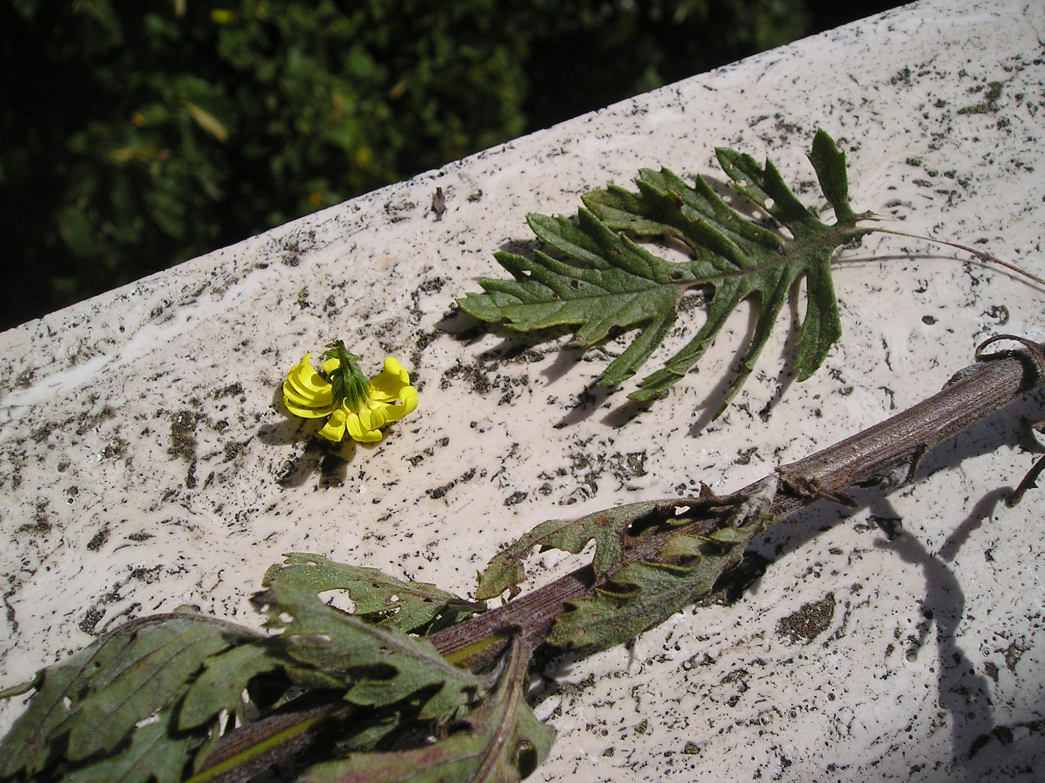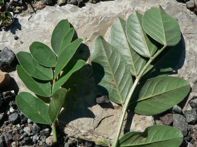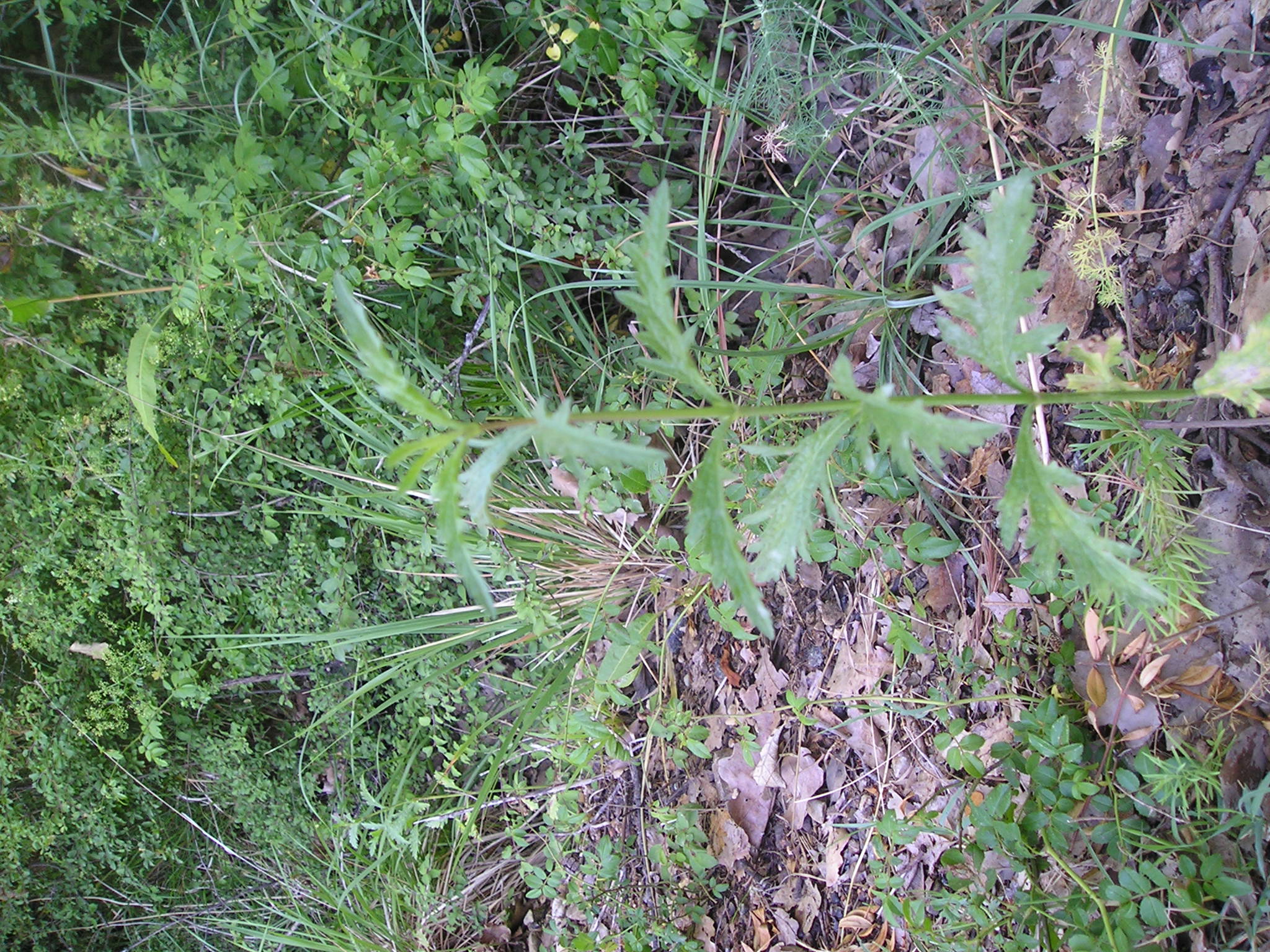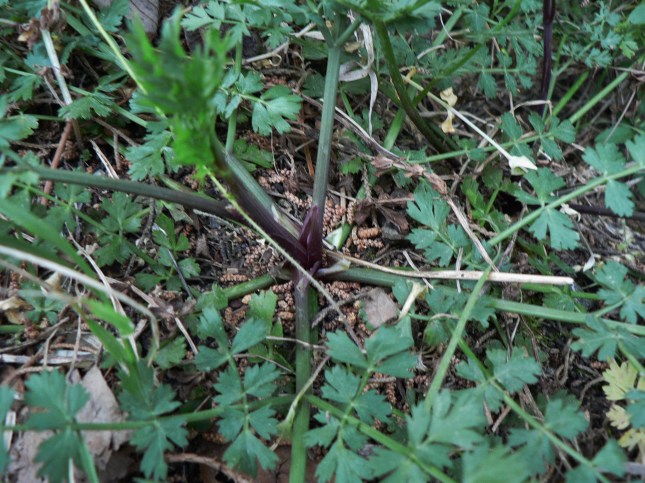 Come si vede dalle foto il butto centrale ha foglie con caratteristiche diverse da quelle basali laterali e si presume porterà alla cima fiori e infiorescenze, le sue foglie sono  strette e lanceolate pennato sette.   I lobi delle foglie iniziali (basali: livello zero) più rigide e scure (foglie davanti in basso della foto precedente, fotografate dopo anche ingrandite), sembrano più rotondeggianti  e forse meno incisi delle successive (foto precedente caule a destra e la foto subito qui sotto), pur mantenendo la forma  tendenzialmente romboidale. La forma dei fusti erbacei con le foglie è essenzialmente triangolare a ‘felce’.