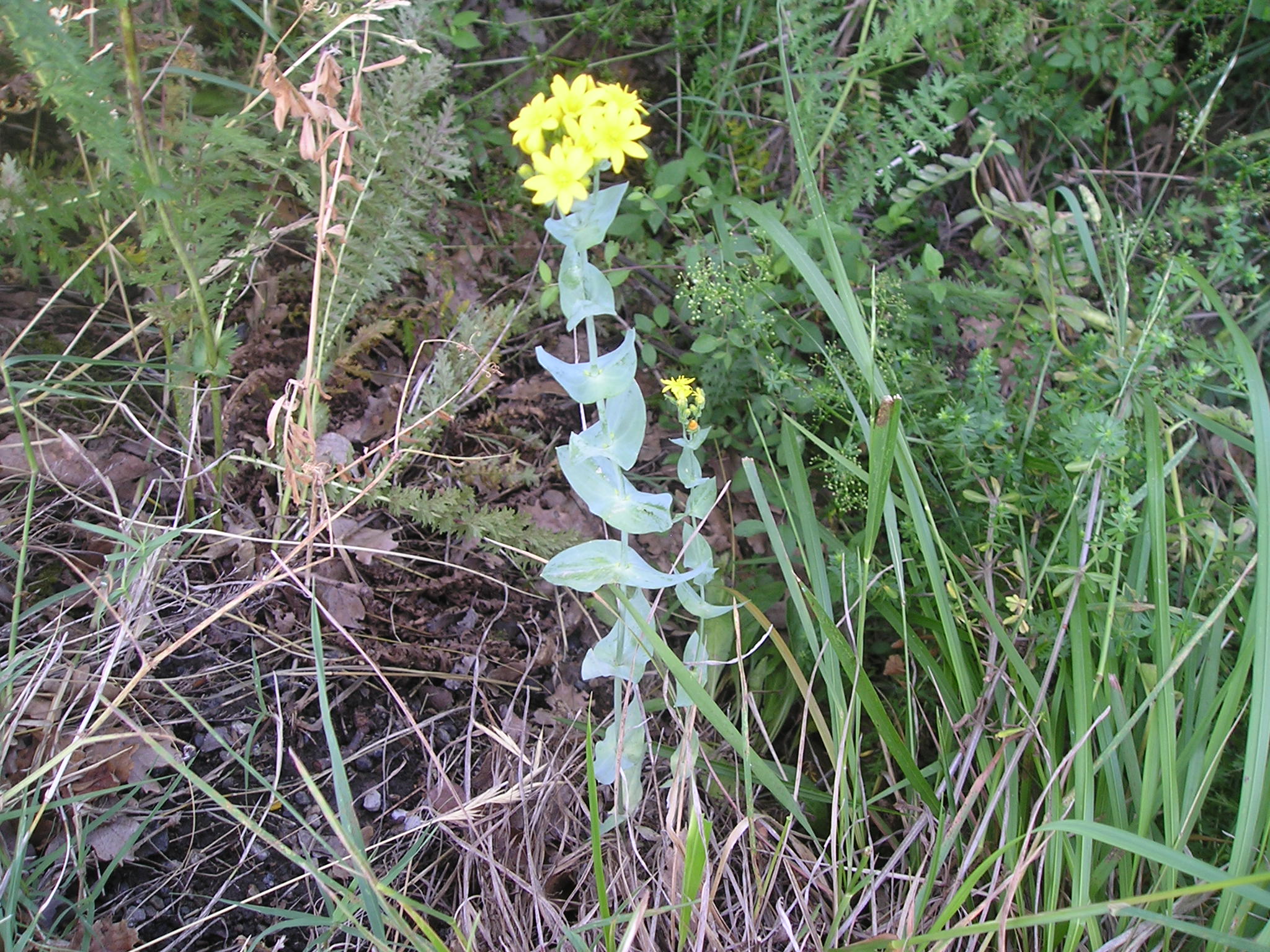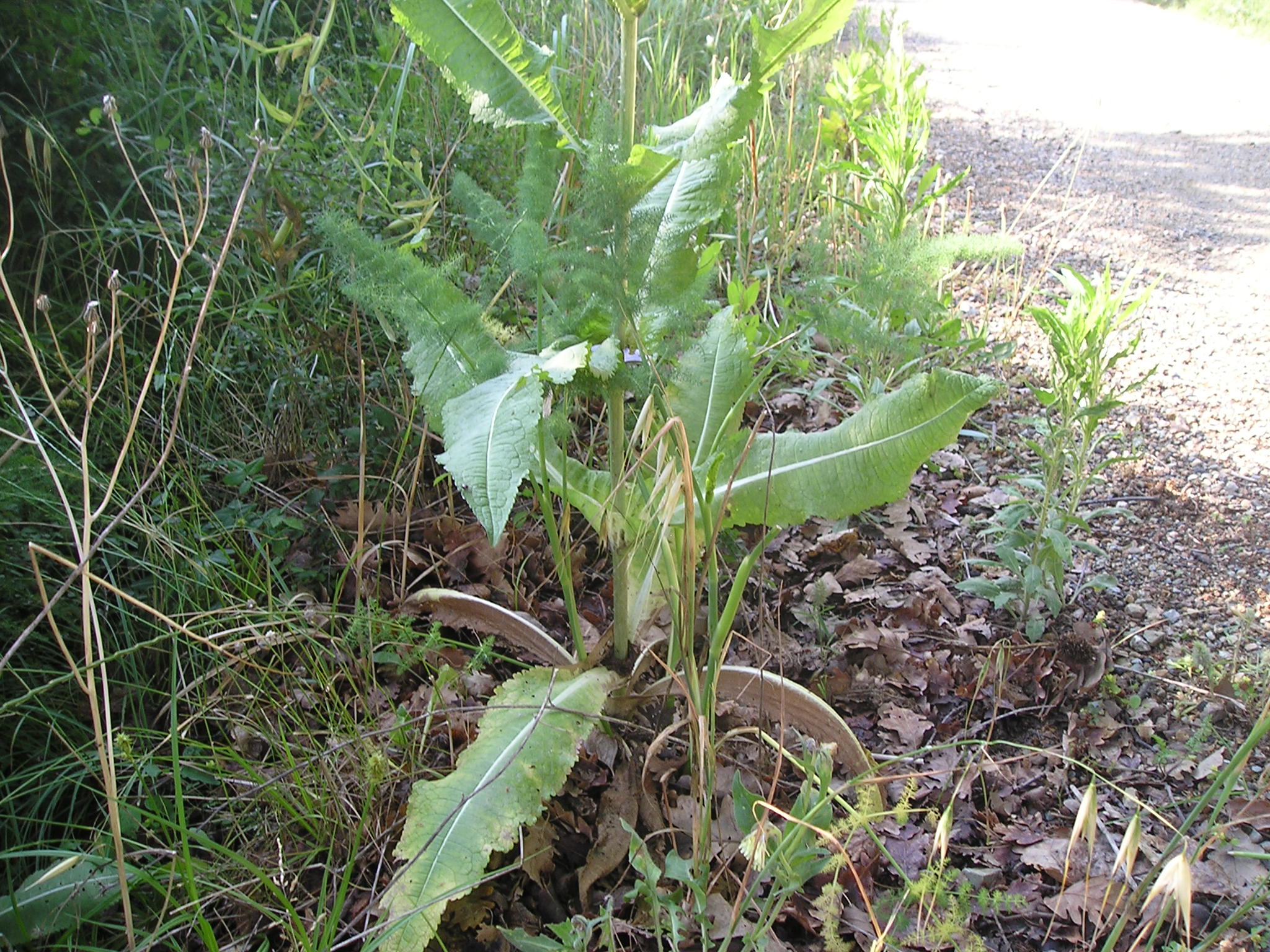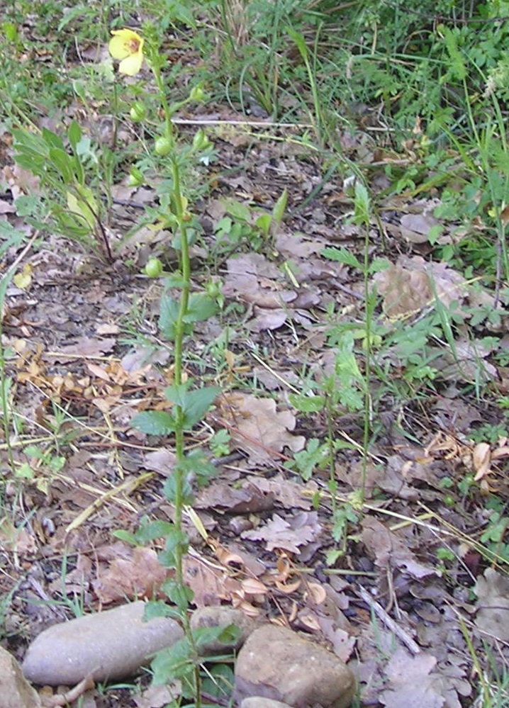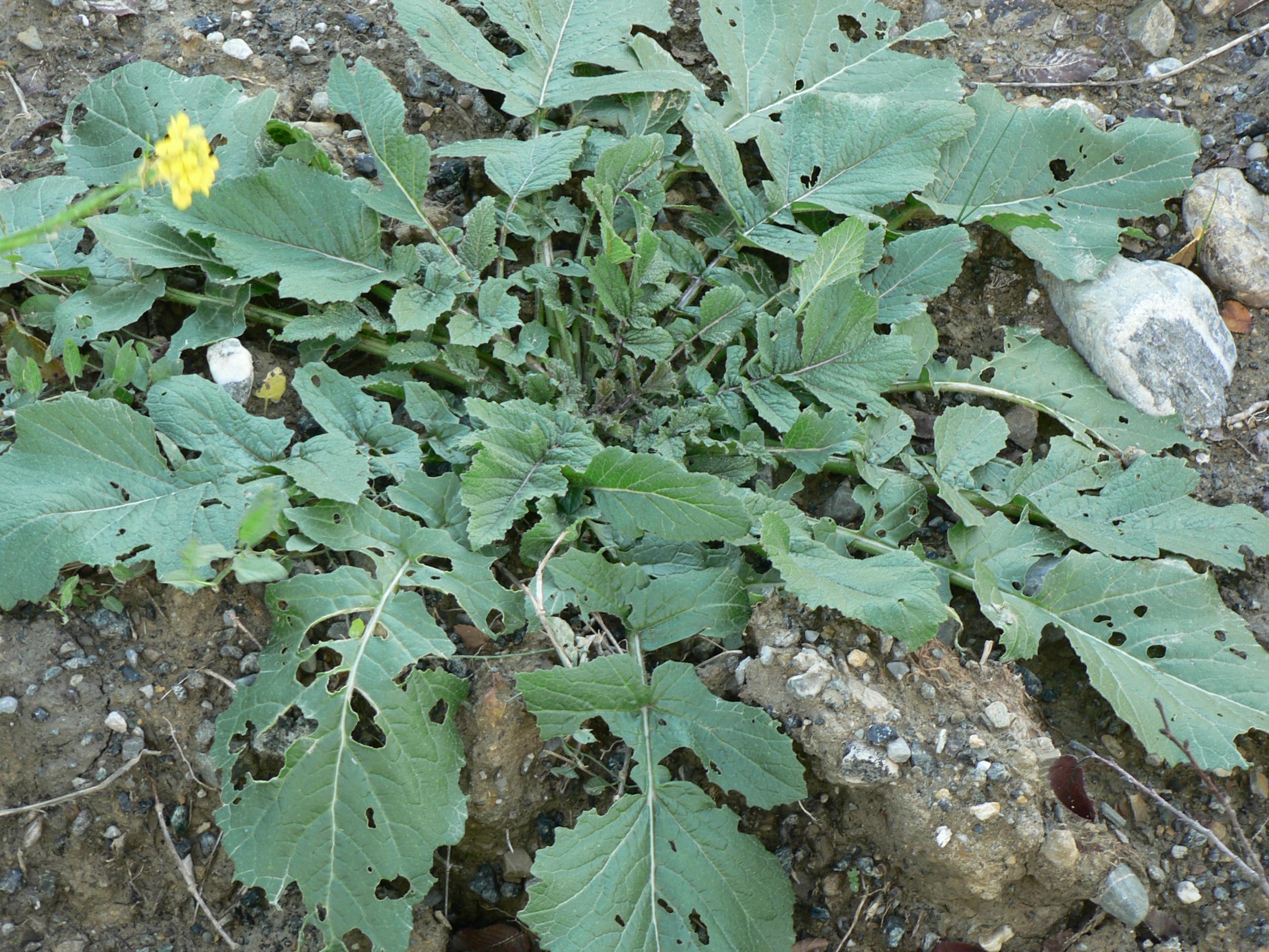 Una specie di ‘rapa’ a foglie larghe 2-3 sette  verso il picciolo, a fiori gialli nata accanto alla Cerinthe al Ponso. A destra si intravede la grande rosetta di base riprese nella foto sotto.