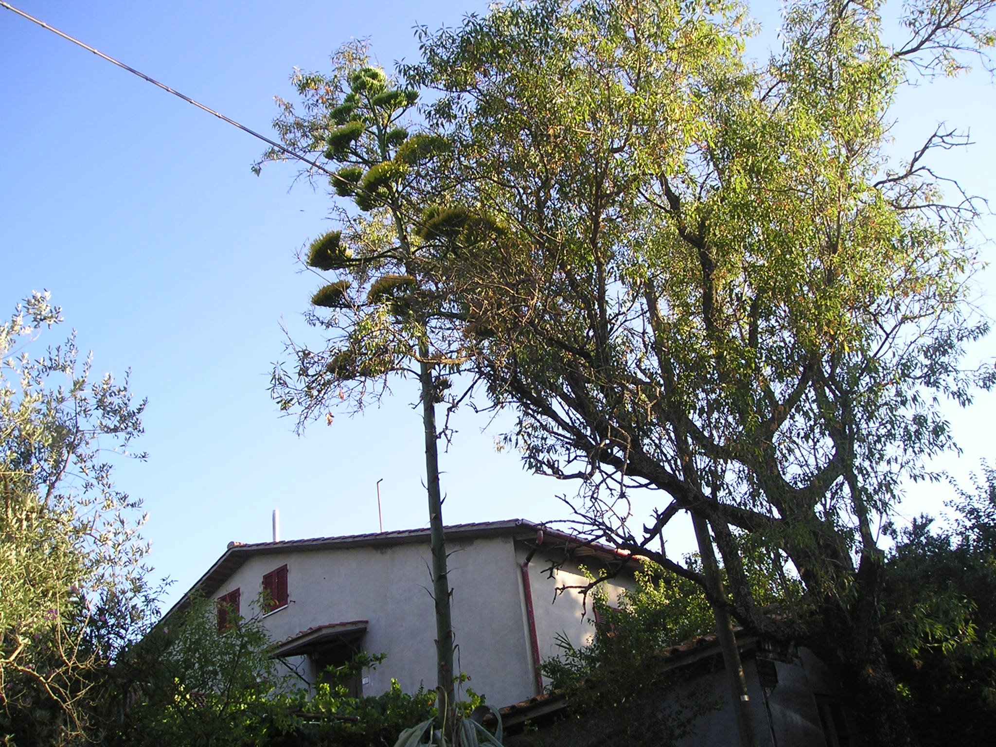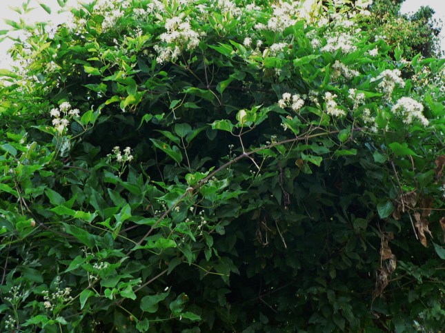 Il Ligustro qui davanti al P. San Domenico è associato ad altre piante della macchia mediterranea (Pistacea lentiscus, Ulmus campestris, Quercus ilex, l’Alaterno, il Viburno, …). Questo fitto ‘arbusteto’ è anche intrecciato con la Lianacea spinosa Smilax aspera (Roghetta-stracciabrache) della quale Cristina a fine ottobre ha notato una seconda vistosa fioritura, invece di <<mostrare i grappoli con le sue belle bacche lucide>> come avrebbe dovuto. La S. aspera è ricordata in paleo-botanica perché, insieme ad altre piante, (per es., l’Alloro, la Palma nana…), rimasero indietro alle nostre latitudini, nella lenta migrazione in tempi geologici delle piante dal Polo verso l’equatore. Segue la foto di Cristina di Smilax in fiore: