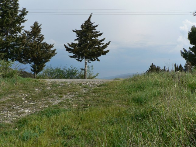 Sulla destra è posto la grossa pietra di calcare marnoso di ingresso a S. ANNA, nascosta dal cespuglio e si intravede appena la punta a destra; foto circa da ovest ad est
