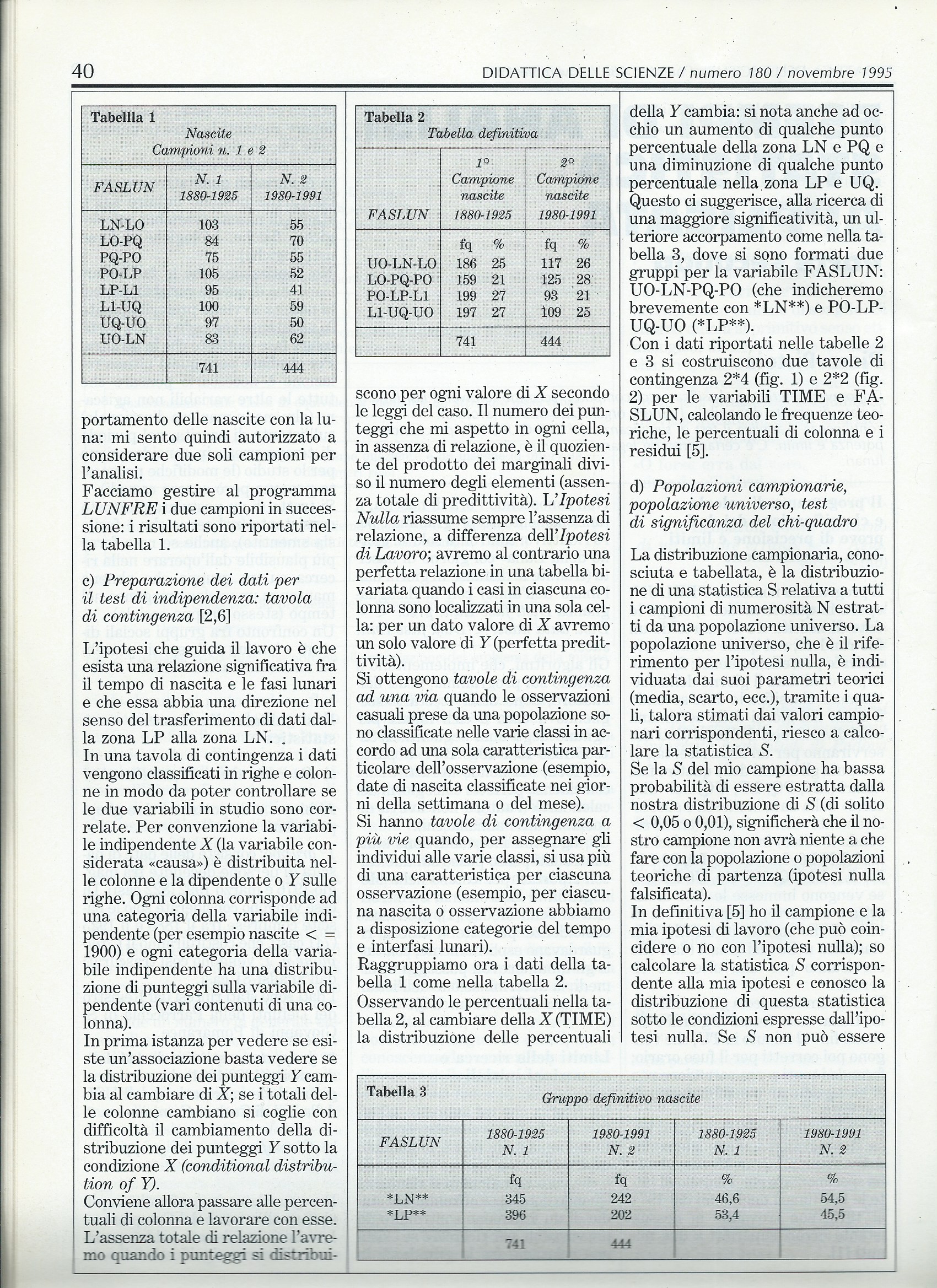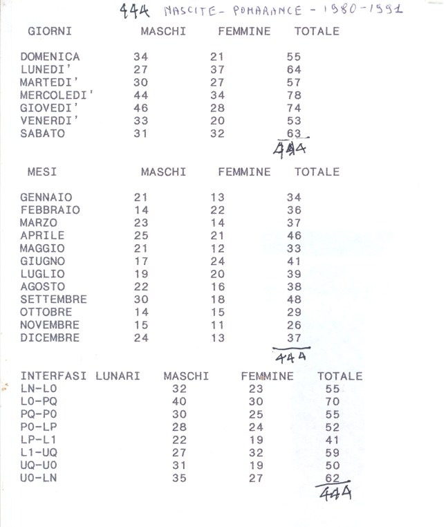 Il secondo Gruppo (CAMPIONE n. 2)  è costituito da 444 date di nascita (11980-1991) riprese dal Registro delle Vaccinazioni dell’USL della Val di Cecina. Un ringraziamento particolare va alla Signora Fulvia Gronchi Borghetti, ostetrica,  per avere ricopiato direttamente a mano dal detto Registro le date di nascita al tempo attuali (444 casi).